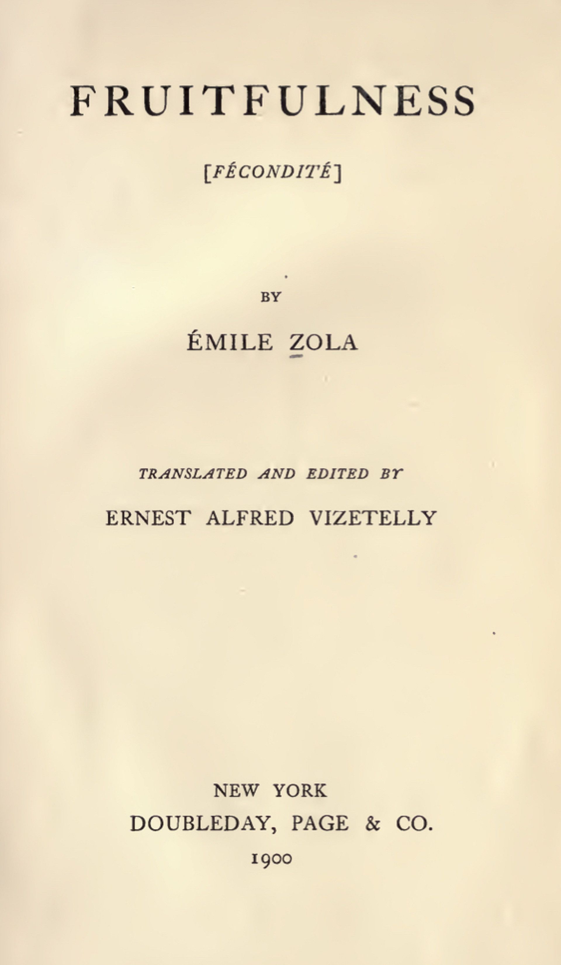 "FRUITFULNESS" is the first of a series of four works in which M. Zola proposes to embody what he considers to be the four cardinal principles of human life. These works spring from the previous series of The Three Cities: "Lourdes," "Rome," and "Paris," which dealt with the principles of Faith, Hope, and Charity. The last scene in "Paris," when Marie, Pierre Froment's wife, takes her boy in her arms and consecrates him, so to say, to the city of labor and thought, furnishes the necessary transition from one series to the other. "Fruitfulness," says M. Zola, "creates the home. Thence springs the city. From the idea of citizenship comes that of the fatherland; and love of country, in minds fed by science, leads to the conception of a wider and vaster fatherland, comprising all the peoples of the earth. Of these three stages in the progress of mankind, the fourth still remains to be attained. I have thought then of writing, as it were, a poem in four volumes, in four chants, in which I shall endeavor to sum up the philosophy of all my work. The first of these volumes is 'Fruitfulness'; the second will be called 'Work'; the third, 'Truth'; the last, 'Justice.' In 'Fruitfulness' the hero's name is Matthew. In the next work it will be Luke; in 'Truth,' Mark; and in 'justice,' John. The children of my brain will, like the four Evangelists preaching the gospel, diffuse the religion of future society, which will be founded on Fruitfulness, Work, Truth, and Justice."