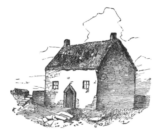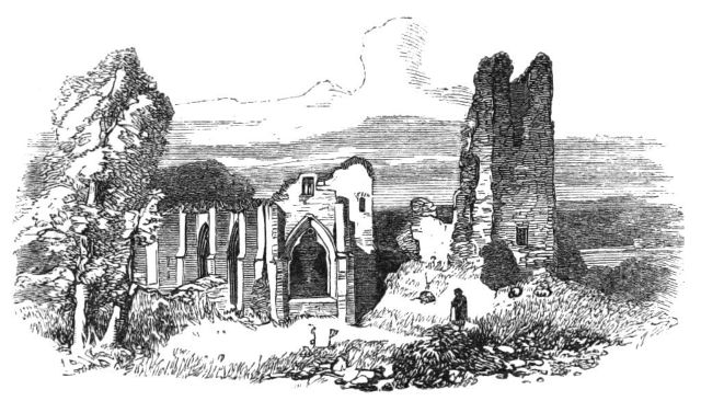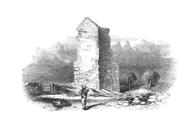 About two miles beyond Doneraile I found, on a wide plain, the ruins of Kilcolman. These ruins have frequently been drawn and engraved, and the views we have of them are very correct. Indeed, so vividly were the features of the scene impressed on my mind by the views, and by reading of it, that I seemed to know it quite well. Its old black mass of wall catches your eye as soon as you have passed the woody neighborhood of Doneraile, standing up on the wild moorland plain, a solitary object amid its nakedness. A tolerable highway, newly constructed, leads up near to it, along which you advance amid scattered Irish cabins, and their usual potato plots. To reach the castle, you have to turn to the left up one of those stony lanes that threaten to jolt a car to pieces, and then have to[Pg 34] scale a gate belonging to the farm on which the ruin stands, and advance on foot, through a farm-yard, and along the lake side. The remains of the castle, which consist only of part of the tower, at the southernmost corner, stand on a green mound of considerable extent, overlooking the lake, or rather a winding sort of pond, overgrown with potamogeton. On one side, masses of limestone rock, on which the castle, too, stands, protrude from the banks, and on the other extends the green marsh, and the black peat bogs, with their piles of peat stacks. To the north, at about a mile's distance, stretch those brown moorland mountains, called by the natives the Ballyhowra Hills, but dignified by Spenser with the name of Mole. Of either of these names the peasants seemed to know nothing, but assured me the one nearest to the castle eastward was called Slieve Ruark. Southward, at a couple of miles' distance, stands another somber-looking tower, the remains of an ancient castle, which they called Castle Pook. On a hill, nearer Doneraile westward, are also the ruins of an abbey; so that, probably, in Spenser's time, this scene might be well wooded; these places inhabited by families of the English settlers; and might form some society for him; but at present, nothing can be more wild, dreary, and naked than this scene, and the whole view around. Turn which way you will, you see nothing but naked moorlands, bare and lonely, or scattered with the cabins and potato plots of the peasantry. To the northeast stands, at perhaps half a mile's distance, a mass of plantations, inclosing the house of a Mr. Barry Harold; and that is the only relieving object, except the distant mass of the woods of Doneraile Park, and the bare ranges of mountains that close in this unpicturesque plain at more or less distance.