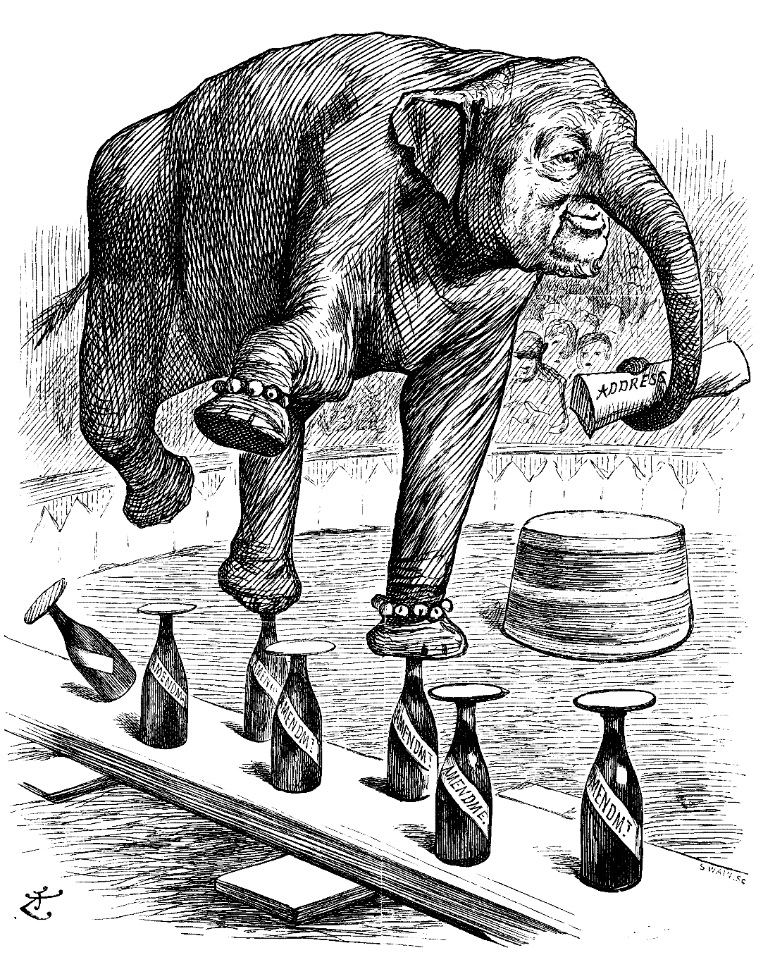 There is a great art in falling gracefully, and it is surprising what a number of interesting, complicated, and unlooked-for attitudes and figures can be thus developed. To ensure perfect confidence at the critical moment, it is as well to hire somebody, say a professional wrestler or prize-fighter, to trip you up and knock you down in all the possible methods. A mattress may be used for beginners to fall on. The more improbable your manner of tumbling, the greater success will you achieve in the eyes of the on-lookers.
