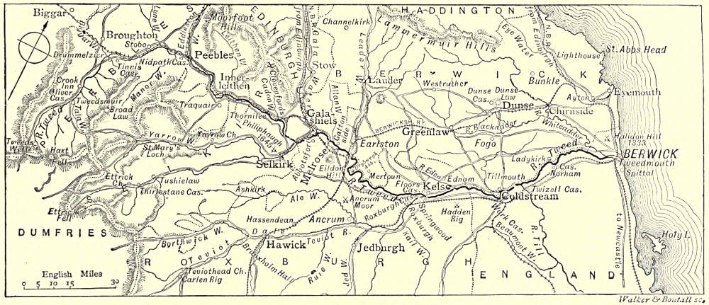 | Berwick-on-Tweed—High Street, Berwick, with the Town Hall—The Royal Border Bridge, Berwick—The Course of the Tweed (Map)—View from the Ramparts, Berwick—Norham Castle—Junction of the Till and the Tweed—Tillmouth House, from the Banks of the Till—Ford Castle—Flodden Field—Twisell Bridge—Junction of the Till and the Glen—The Glen at Coupland—Coldstream Bridge, from up-stream—Ruins of Wark Castle—Kelso, with Rennie’s Bridge—Dryburgh Abbey, from the East—Ruins of Roxburghe Castle—Melrose Abbey, from the South-East—Melrose Abbey: the East Window—Abbotsford—Galashiels—Peebles, from a little below Neidpath—Neidpath Castle—Hart Fell | 72-112 |