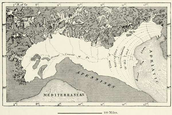 The Alps, whose ancient Celtic name probably refers to the whiteness of their snowy summits, stretch in an immense curve, more than 600 miles in length, from the shores of the Mediterranean to the plains of the Danube. They consist in reality of more than thirty mountain masses, representing as many geological groups, and joined to each other by elevated passes; but their rocks, whether they be granite, slate, sandstone, or limestone, form one continuous rampart rising above the plains. In former ages the Alps were higher than they are now. This is proved by an examination of their detritus and of the strata disintegrated by natural agencies. But, whatever the extent of detrition, they still rise in hundreds of summits beyond the line of perennial snow, and vast rivers of ice descend from them into every upland valley. Looked at from the plains of Piedmont and Lombardy, these glaciers and snow-fields present the appearance of sparkling diadems encircling the mountain summits.