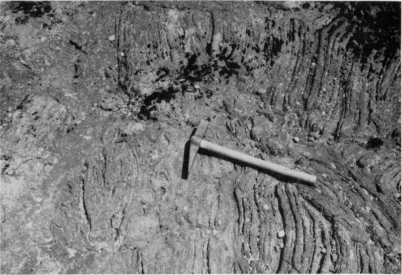 Figure 12. Outcrop on south Lookout, summit of Burke Mountain. Distorted layers of Gile Mountain metamorphic rock. Lath-like crystals developed along some of these layers during the second period of metamorphism, that is, when the granite invaded the metamorphic rocks. For scale, the hammer handle is about one foot long.