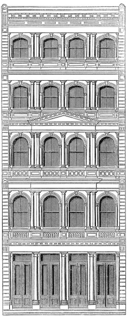 The elevation, shown in the accompanying page illustration, shows an iron front of five stories, having a pedimented centre frontispiece of three stories in alto relievo.