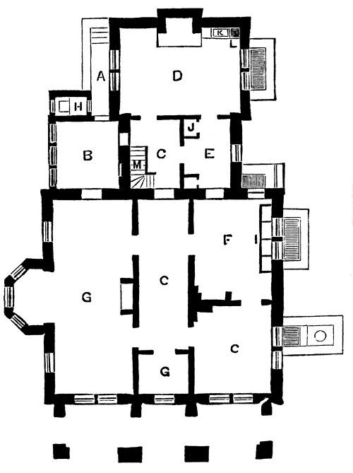 A, The Porch, pierced on each side with open lights. B, the Hall, in the form of an L, and receiving light from the roof. C, the Drawing Room, with its capacious bay window. D, a Parlor. E, Library and Study. F, Side Hall, with door, under stairs, communicating with passage leading to study; (or, there may be a door opening directly into the study from the side hall.) G, Private Stairs. H, Principal Stairs, under which is a door communicating with the passage to study. I, the Kitchen. J, Pantry. K, the Dining Room, with glass door leading out into the Conservatory L.