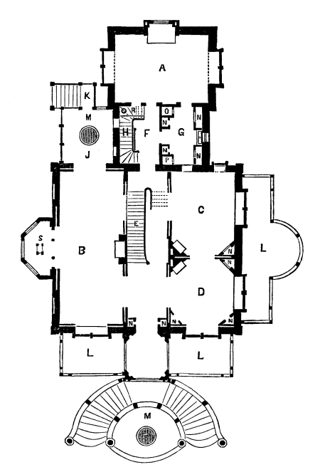 Fig. 2 shows the plan of the principal story. A, Dining Room. B, Drawing Room. C, and D, Parlors connected by sliding doors with the Drawing Room through the hall. E, Principal staircase. F, Back Hall. G, Butler’s Pantry with dumb waiter, plate closet, wash-trays, etc. H, Back stairs. J, Conservatory. K, Steps leading down to Yard. L, L, L, Verandahs. M, M, Piscinæ.