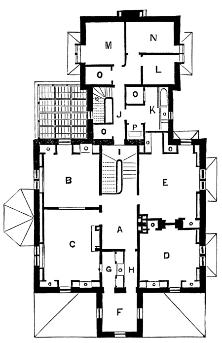 Fig. 3 shows the arrangement of the Chamber floor, or second story. A, the Hall. B, C, D, and E, Chambers. F. Boudoir. G, Closet. H, Passage to Boudoir. I, Half landing connected with rear addition. J, Back passage. K, Bath Room. L, M, N, Servant’s Bed Rooms. O, O, O, Clothes Closets. P, Water Closet, o, o, o, o, o, o, Wardrobes in the several Chambers. These occupy the angle enclosed by the slope of the Mansard, thus leaving the walls of the chambers plumb.