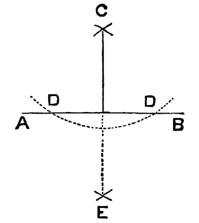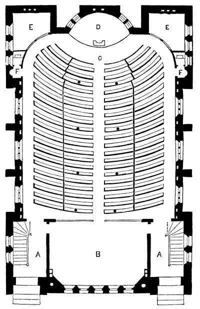 Fig. 1. The plan of the Lecture Room is here shown: A, A, the entrances, with stairs in each, leading to School Rooms and continuing to Gallery. B, Ladies’ Parlor. C, the Lecture Room. D, Platform and desk. E, E, Class-Rooms. F, F, Water-Closets.