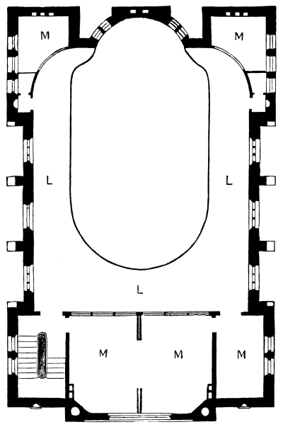 Fig. 3. L, L, L, the Gallery. M, M, M, Class Rooms in front. M, M, Class Rooms in rear. It will be seen that, by means of sliding glass partitions, each floor can be considerably enlarged in accommodation. There are nine class-rooms, and school room for over six hundred children. The galleries will hold two hundred and fifty.