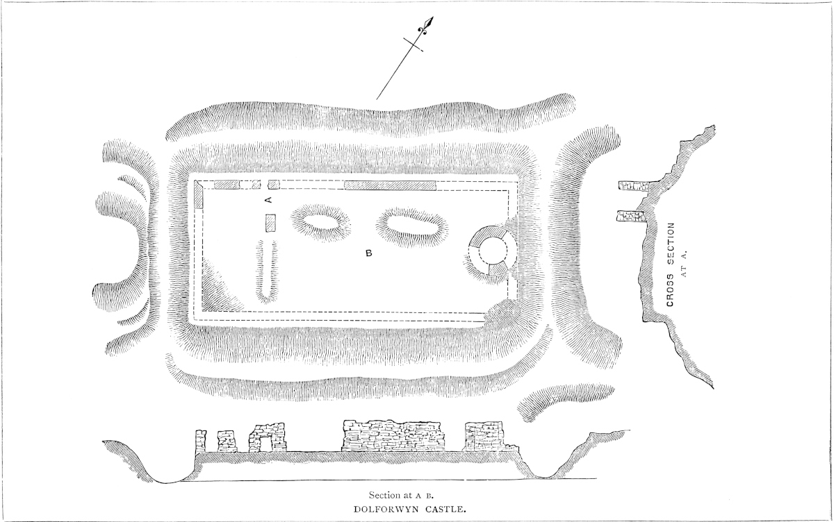 Dolforwyn has no history. All that is known is that it was granted by Edward I. [7 Edward I.] to Roger Mortimer of Wigmore as “the Castle of Dolvoron,” with the territories of Keddewy and Kery, to be held by the service of three knight’s-fees. In 14 Edward I. the castle was still held by a Mortimer, for Richard Labaunk was in prison at Wigmore, by reason of arrears in his account to Edmund de Mortimer whilst constable of his castle of Dolfnovan. He was liberated on bail. In 18 Edward I., Bogo de4 Knovill, being constable of Montgomery Castle, had a pardon for £90 due on his farm of lands of Kery and Kidgewenny. This, however, was from the king, who seems to have resumed possession. Dugdale says the castle was built by David ap Llewelyn, who flourished 1240–46, but the Welsh attribute it to Bleddyn ap Cynfin between 1065 and 1073. Bleddyn may have had some kind of stronghold here, as a place very convenient for a raid upon the flat country, then held by the English; but he certainly did not build the existing walls. These are not unlikely to have been the work of Roger Mortimer, and their destruction probably followed at the first convenient opportunity. The name of the castle has not been found in the Mortimer inquisitions, nor is it mentioned save as above, among their possessions, or those of any other landowner. After the settlement of Wales it would cease to possess any value.