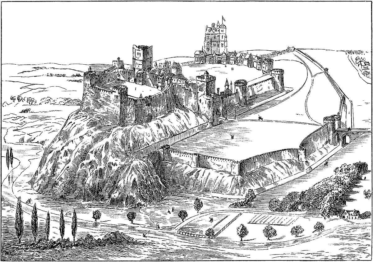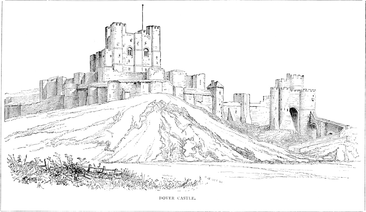 The Normans landed, as their Teutonic ancestors had landed centuries before them, beneath the ancient walls of the Roman Anderida, which, under the name of Pevensey, had become an English, and was to become ere long a Norman fortress. Pevensey is a haven no longer, but within its circuit may still be seen huge fragments of Roman and Norman masonry, and the simpler, but, at least, equally durable mound of its English occupants, a grand and striking composition, and, to the instructed observer, eloquent of great events. William took possession of the ruins, and, on the following day, marched upon the battlefield, hastily fortifying with wood and earth the hill of Hastings in support of his position. After the battle Romney first felt the weight of the Conqueror’s hand, and he then turned to Dover. The castle was, says William of Poitiers, impregnable, and the town even then considerable; but the people, though assembled in vast numbers, had no leaders, and town and castle were at once surrendered, though in the transfer, either by design or accident, much of the town was burned. William paused here eight days, detained by sickness among his troops. He treated the people with great lenity, placed a Norman garrison in the castle, to the defences of which he added, and then proceeded towards the Thames, receiving the submission of Canterbury and Rochester on his way. Kent was placed under the command of Bishop Odo, who held Dover as its military centre. This continued to be its position, and in 1074, when the fierce Jutish blood broke out, and the men of Kent, headed by Eustace of Boulogne, rose against William, their first object was to gain Dover Castle, to which they laid siege. Its defences, whether English or Norman, were strong, but the attack was sharp. Bishop Odo and Hugh de Montfort, who had the castle in charge, were absent, but they exerted themselves in the county, and the castle was relieved. Towards the end of the reign the town is said to have been walled, and to10 have had ten gates. Its position, as the most important of the Cinque Ports, seems to have been established, to which its castle largely contributed. The five ports were Hastings, Romney, Hythe, Dover and Sandwich. Winchelsea and Rye were among the members. Their service was to provide fifty-seven ships annually, of which number Dover furnished twenty-one.