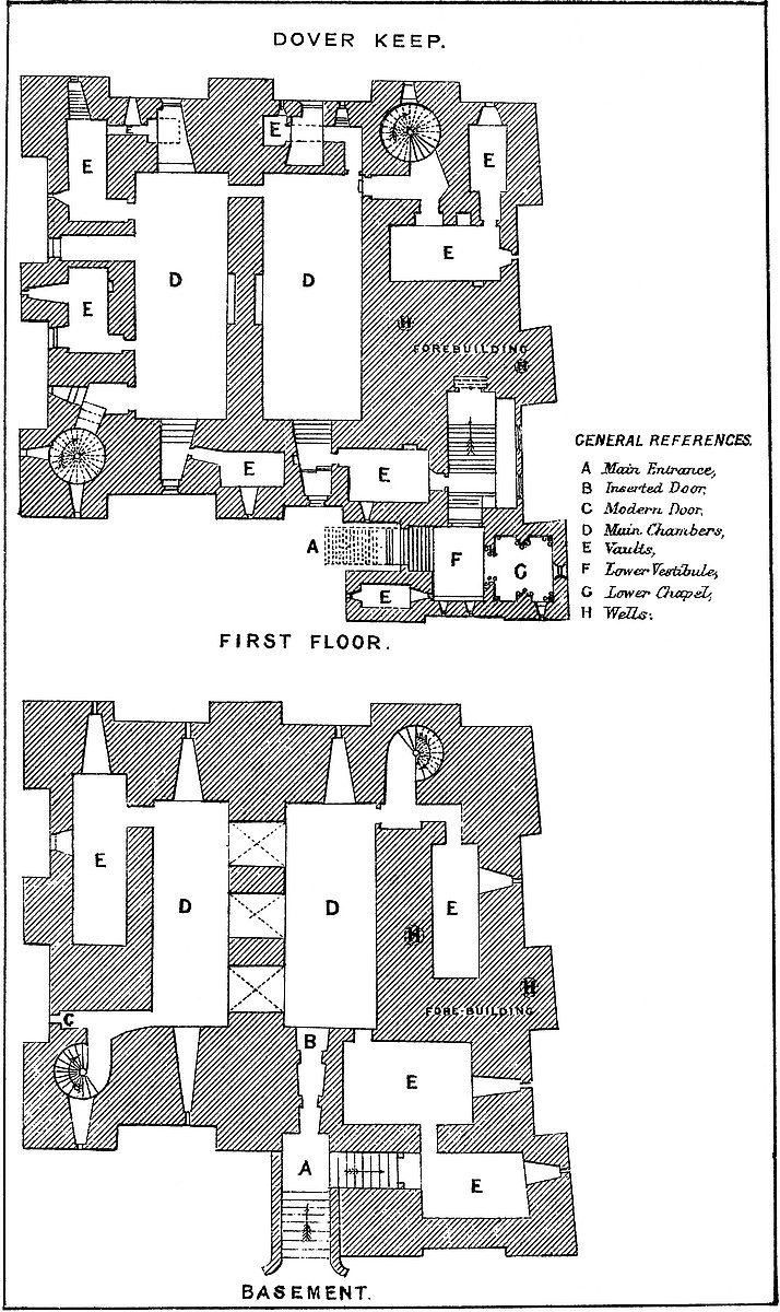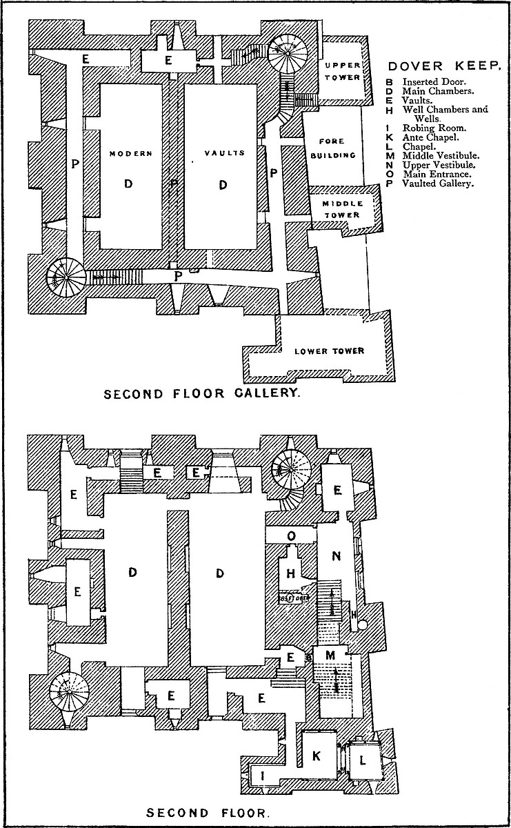 Dover Castle is called by Matthew Paris “the very front door of England,” and described by William of Poitou as “Situm est id castellum in rupe mari contigua quæ naturaliter acuta undique ad hoc ferramentis elaborate incisa, in speciem muri directissima altitudine, quantum sagittæ jactus permetiri potest consurgit, quo in latere unda marina alluitur.” It presents a good combination of the defences of several architectural periods, the general result being a concentric fortress, the growth of many centuries, and which, a century ago, presented much both of earthwork and masonry of great and unmixed antiquarian interest. More recently, however, the works have been delivered over to the military authorities of the country, and the result has been a series of alterations, additions, and removals, necessary, it is in all courtesy to be presumed, for the defence of the country, but very destructive of the ancient features of the fortress. The ancient earthworks have been scarped, extended, retrenched, and tunnelled, barracks and magazines have been built, the keep has been converted into storerooms and water-tanks, and in its basement are two powder magazines. In its present condition, and having regard to the strict regulations, prohibiting even the use of the pencil, under which the whole is placed, an accurate examination of what remains of the ancient works, whether in earth or masonry, is almost impracticable.