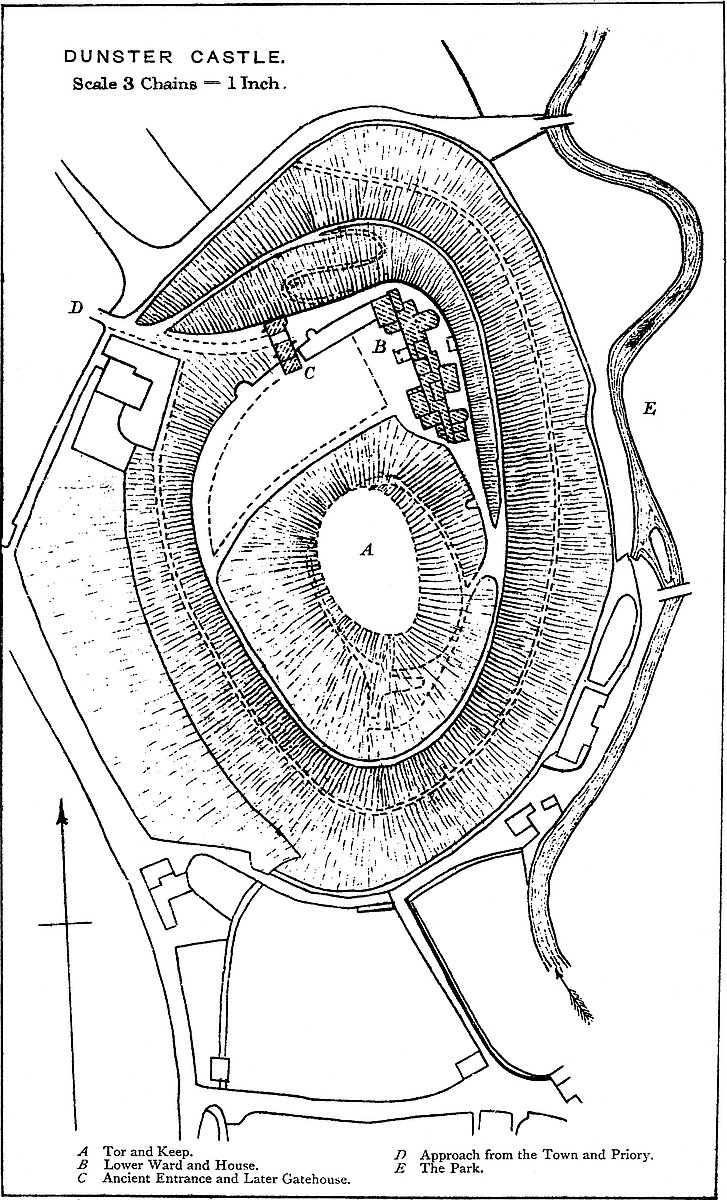 THE Castle of Dunster is of high antiquity, and for many centuries was a place of great military consideration in the western counties. It was the caput of an extensive Honour, and the chief seat of a line of very powerful barons. The hill upon which it stands is the north-eastern, or seaward extremity of a considerable ridge, from which it is cut off by a natural depression, and thus forms what is known in West-Saxon nomenclature as a tor. The tor covers above ten acres of ground, and is about 200 feet high, with a table top in area about a quarter of an acre. It stands upon the western edge of a deep and broad valley, which contains the park, and below the castle expands into a tract of meadow about a mile in breadth, skirting the sea from Minehead to below Carhampton. The park is traversed by a considerable stream, the Avill, one head of which springs from Croydon Hill, and the other, flowing past Wootton-Courtenay, rises about six miles distant under Dunkery Beacon. The home view, one of exceeding richness, is limited and sheltered on the south and west by the Brendon Hills and the high ground rising towards Exmoor. To the east it includes the vales of Cleeve and Williton, bounded by the Quantocks. Seaward on to the north the eye ranges over Bridgwater Bay to the headland of Brean Down and Worle, and commands the west or opposite coast from Penarth Point to Aberavan and Swansea.