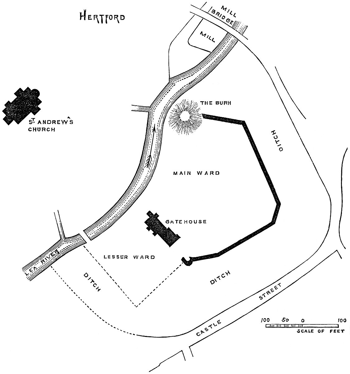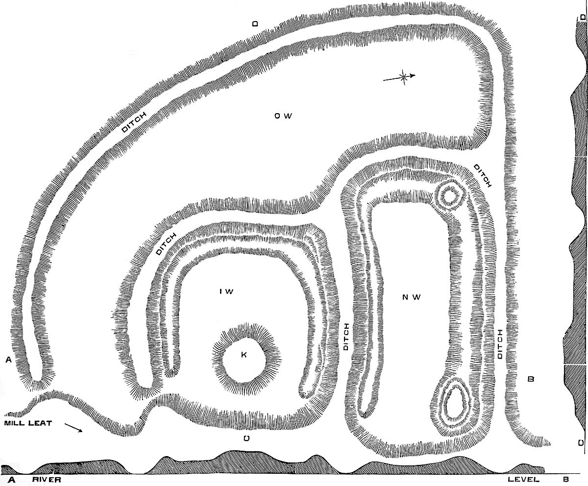 The work is composed of three parts—an Inner, Northern, and Outer ward. The inner and north wards lie side by side upon the river, separated by a cross ditch. The two are contained within another ditch, which communicated at each end with the river. Beyond this, covering the south-western front, is the outer ward, and beyond this again the outer ditch, which commences at the south-east corner in the mill leat, covers the south-western front, and at the north-western angle sweeps round to join the ditch already mentioned, and thus, through it, to communicate with the river at the north-east corner of the work.