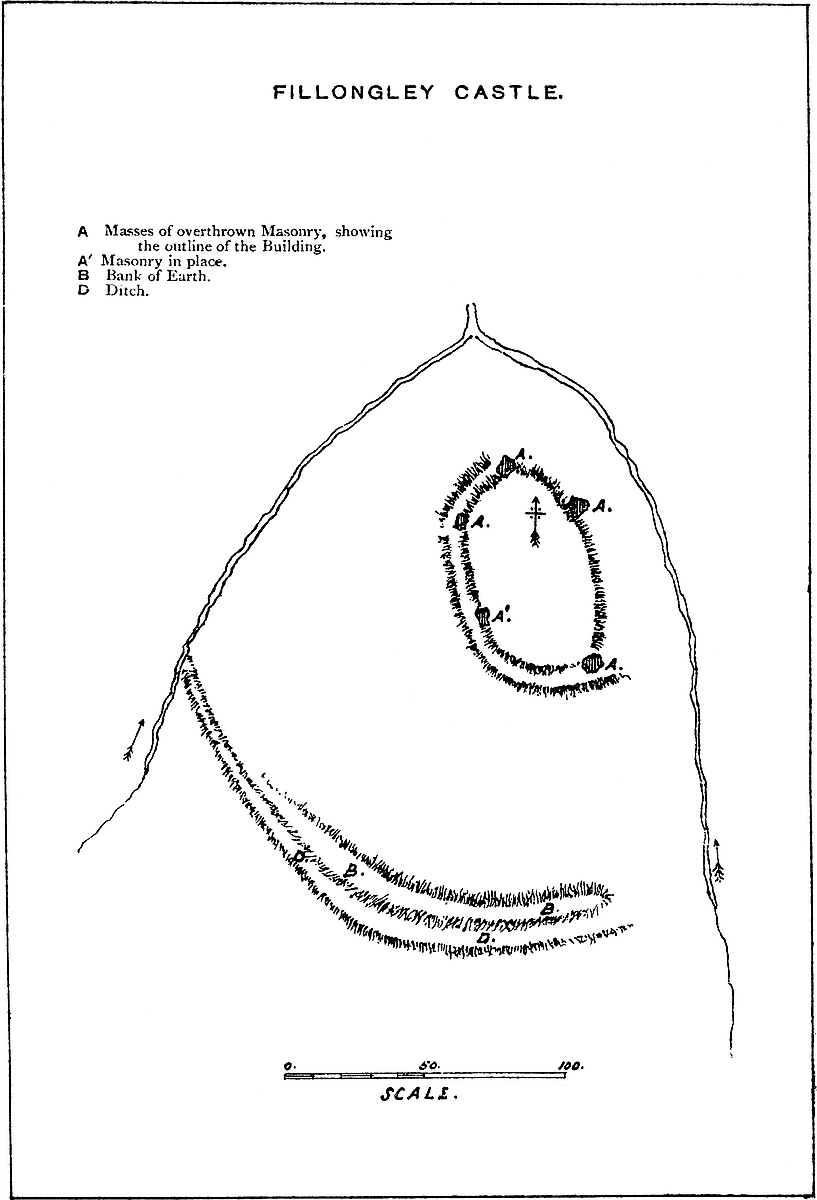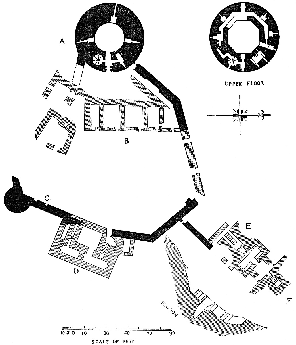 The most considerable remains of its wall are towards the south-east, and it probably had, on this side, a ditch of its own. The hall and other of the domestic buildings seem to have stood here, on the level part, judging from the very rude outline of the foundations.