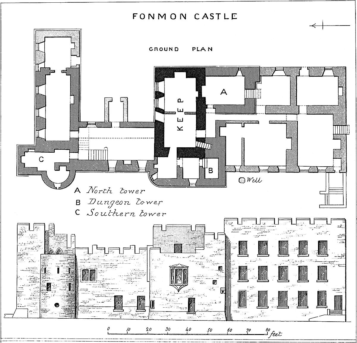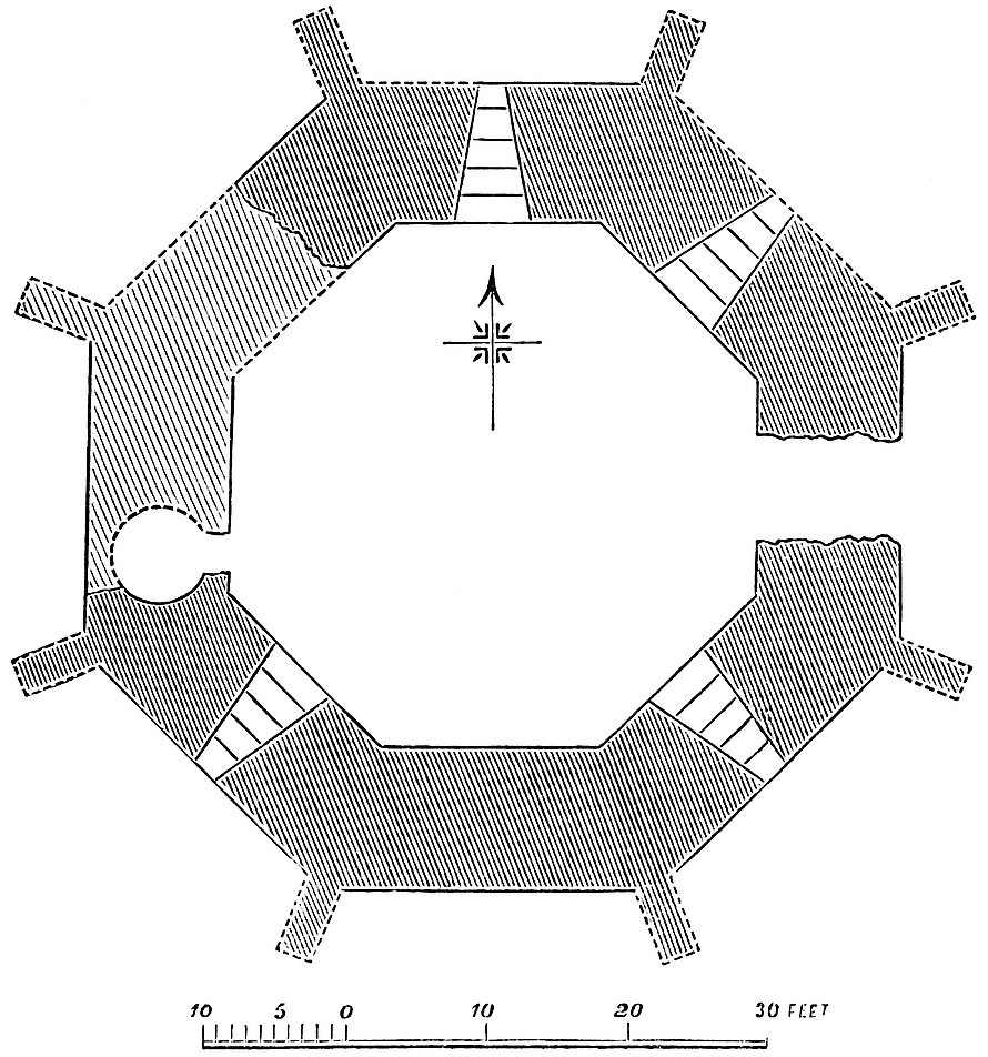 Beyond this door the staircase rises by twelve steps to a broad landing at the end of the vestibule. Besides the Tudor doorway and window, on the same side, higher up, are loops from two mural chambers of the second floor of the keep, and in the south wall over the stairs a small door, not now used, which opens into the ante-chapel. In the north wall of this vestibule, a doorway of 5 feet opening, the third in order upon the stairs, opens into a passage 6 feet wide, which pierces the wall of the middle tower, here 6 feet thick, the whole tower being 14 feet. From this doorway a flight of twenty steps, 8 feet wide, ascends into the upper vestibule, to a large landing 19 feet by 14 feet. The vestibule itself is 25 feet by 14 feet, and lies between the middle and upper tower of the forebuilding. In the east wall, which has been rebuilt with the roof, are two modern windows. In the south wall a narrow passage, 10 feet long by 3 feet broad, leads to the outer well, the ashlar pipe of which is 4 feet diameter. It seems to have been used in modern times as a cesspit, and is choked up. The well is placed in the centre of the tower, which seems to have been a mass of masonry. At present the wall round the well has been broken away so as to form a rude chamber. It cannot now be ascertained whether the well stopped at this level, as is probable, or was carried up to the roof of the tower. In the north end of the vestibule, looking down upon the staircase, a door leads into a vaulted guard-chamber, 16 feet by 10 feet, with loops to the north and east, and a deep recess in the west wall. In the west wall of the vestibule is the great door of the keep and a loop from the well-chamber. There are traces on this wall of ashlar, as though it was originally intended to vault and groin this vestibule.