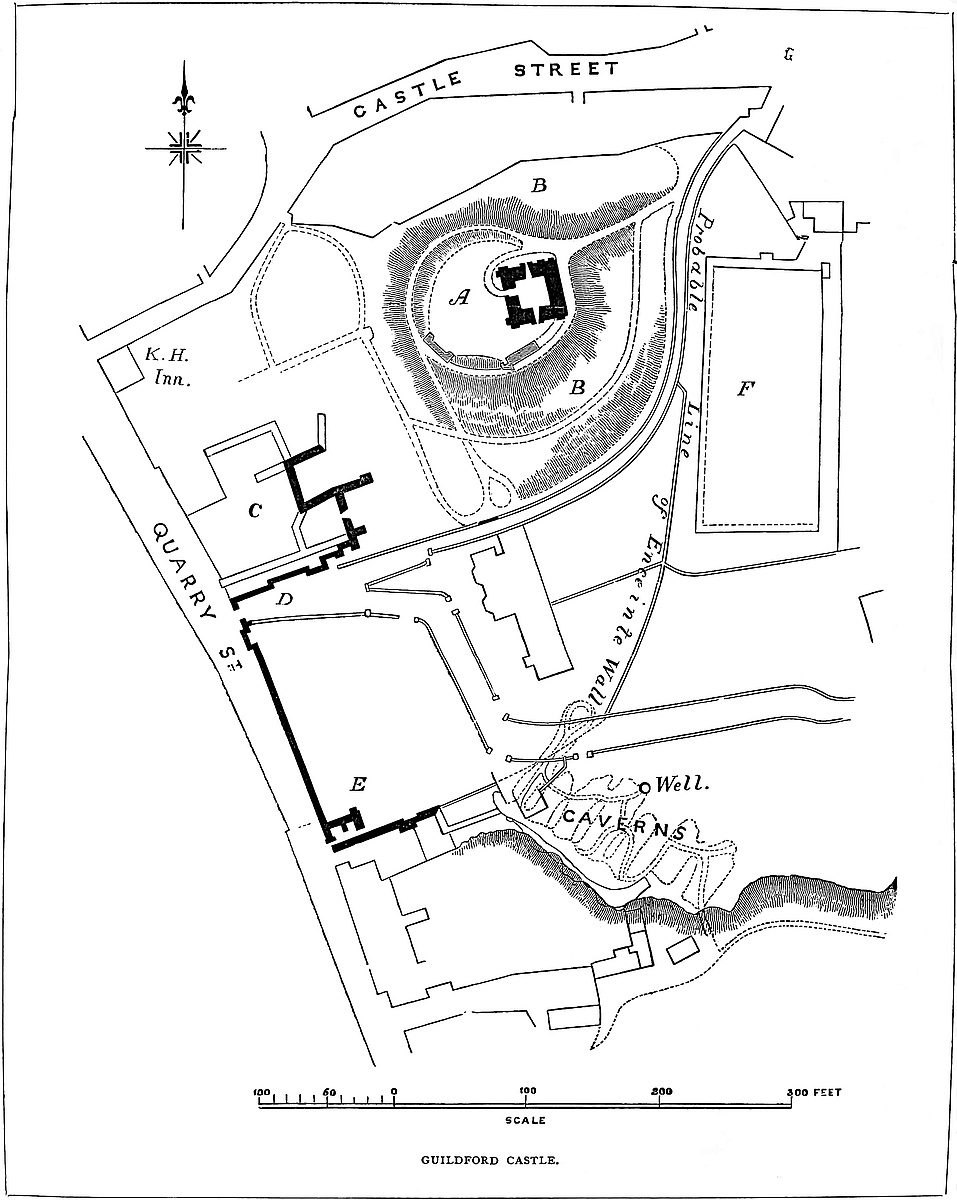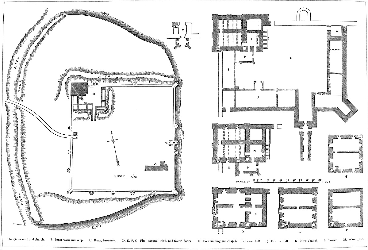 There are two entrances, the north, or King’s Gate, and the south, the Duke of Suffolk’s, or Palace Gate. The gateways are vaulted passages, with a flat segmental arch, opening externally between two square flanking towers. There is a groove for a portcullis, and the vaults have an early English import. Each of these gates is defended by an additional work. A sort of hornwork is thrown out in advance, enclosed within a wall with towers, and with a second gate placed obliquely to the first, to allow the approach to be commanded. The north, called the King’s Gate, is tolerably perfect. The southern outwork is nearly destroyed. It had two gates, one to the south, connected with which was the tower containing a well, and one to the east, called King Arthur’s Gate, close to which was the Armourer’s Tower, and near this was Earl Godwin’s Postern. The masonry of this inner ward was probably of the date of the keep. It was included within a broad and deep ditch, now incomplete, on the southern front.
