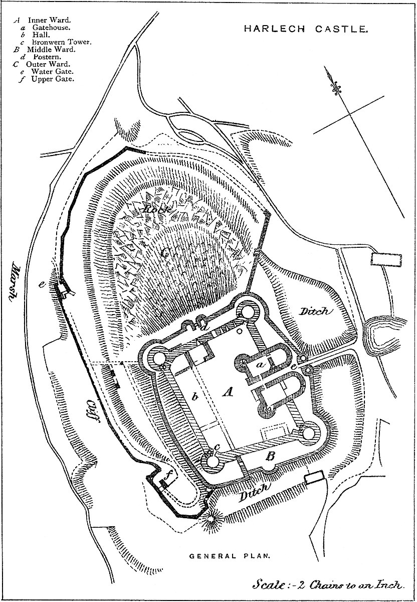 The middle ward is less easily traced. It seems to have been concentric with the outer ward; like it, appended to the south-east face of the inner ward, but of much smaller area, and much of that area occupied by the steep hill-side.