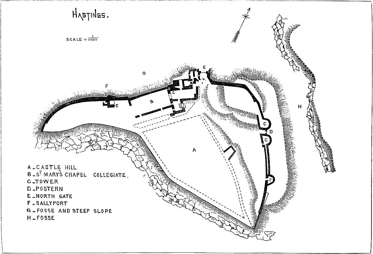 Sixteen towers, including Clopton, Godsfoe, Magminot (4), and Crevequer’s Towers (2), protect the north-west face. Clopton is a hexagon; the name of Magminot is borne by four towers. The two towers bearing the name of Crevequer mark the position of the great postern, a very curious work. Passing from the north gate of the inner ward, a range of arches cross the ditch and the outer ward, and terminate abruptly in a large low pier with salient angles to the right and left. Opposite to the pier, and no doubt at one time connected with it by a drawbridge, rise a pair of circular towers (Crevequer), connected by a heavy curtain and flanked by lesser towers (Magminot) at short distances, all forming part of the enceinte of the outer ward. Towards the field the curtain has a salient angle, and from its base a covered gallery descends into the outer ditch, and there reaches St. John’s, a drum tower built in the middle of it. The gallery passes through the first story of the tower, and terminates in the counterscarp, in a circular chamber cut in the chalk, and from this chamber three tunnels radiate to different parts of the glacis, of which one formerly led to a distant postern, and another still communicates with the old spur-work, attributed to Hubert de Burgh, and converted into a modern ravelin. Two other tunnels, apparently of Edwardian date, leave the main gallery under the castle wall, and the basement floor of St. John’s contains two sally ports, opening into the bottom of the ditch. The modern access to these galleries is by a shaft sunk in the pier of the old drawbridge, but the old entrance was nearer the curtain. The French siege of 1216 was directed upon this quarter. The approaches were made from the west below the Constable’s Gate, and under cover of a trench and breastwork. While the attack was impending Sir Stephen de Pencester brought a reinforcement into the castle by the postern under Godwin’s Tower. De Burgh, taught by experience, threw up the advanced work which still, under a changed form, covers the northern end of the castle, and it was to reach this in safety that the gallery from St. John’s Tower was executed.