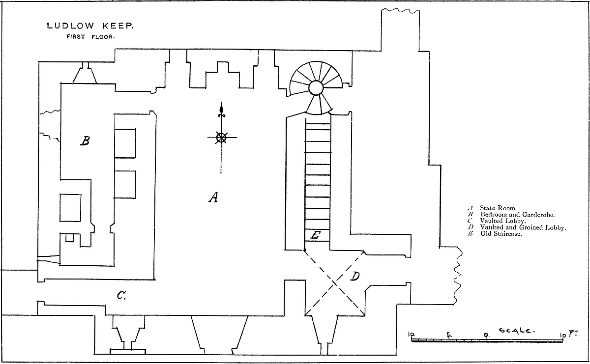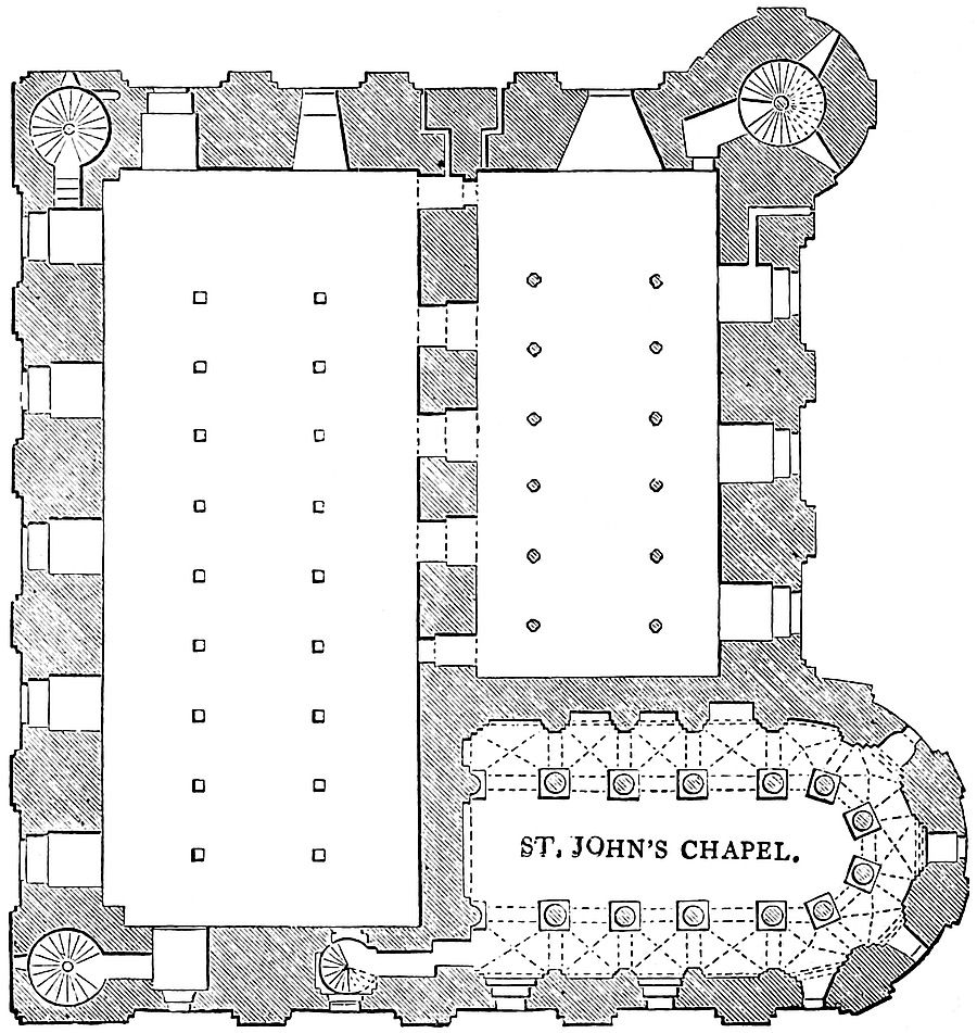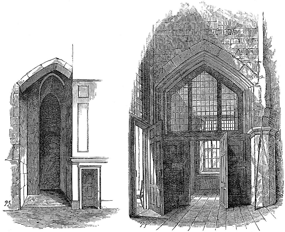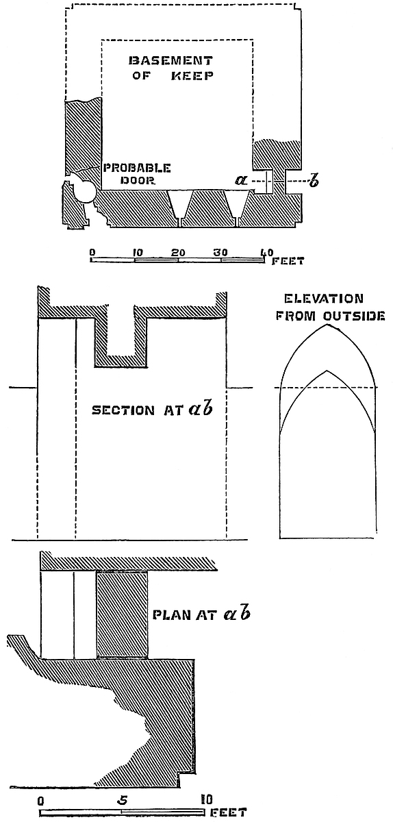 The east chamber, 55 feet by 24 feet, is entered on the east side, near the north end, by a large, full-centred doorway, flanked outside by nook shafts. From this a vaulted passage, 5 feet broad, traverses the wall, here 16 feet thick, and descends by eight steps into the main chamber. This inconvenient height was evidently given to secure headway for the vault below the vestibule. In the entrance passage, on the left or south side, a door opens into the well chamber, a vault, 16 feet by 8 feet, with a loop to the east upon the great staircase. At the south end of the vault, upon a step, is the well, 4 feet diameter and 289 feet deep, lined, as far as can be seen, with ashlar. In the east wall is a recess for a spare bucket. Near the entrance, at the north end of the east wall of the great chamber, a door leads into a curved passage which descends eleven steps into the north-east staircase. At the south end of the same wall a large arch, 5 feet above the floor, opens into a mural chamber 8 feet by 7 feet. This arch has been reduced by modern brickwork, to support the great vault. In the same chamber a loop opens upon the grand staircase, and in the south wall is a door and a descent by eight steps towards the chapel. It is possible that the loop was originally a small door leading into the upper floor of the middle tower of the forebuilding, and that thence, in Tudor days, a small wooden gallery led to the north door of the ante-chapel. In the south end of the great chamber is a window recess of 7 feet, opening with nearly flat sides. In its west jamb is a fireplace, in the east a door leading into a mural vault 18 feet by 12 feet, over that by which the first floor is entered. This vault has a loop to the east upon the great staircase, on the north the eight steps, already mentioned, and in the south wall a narrow door and mural passage leading to the robing-room and ante-chapel. In the north end of the great chamber, near the north-east corner, a door opens into a chamber 7 feet by 5 feet, which lies in the north wall below the window recess, here of 8 feet opening.