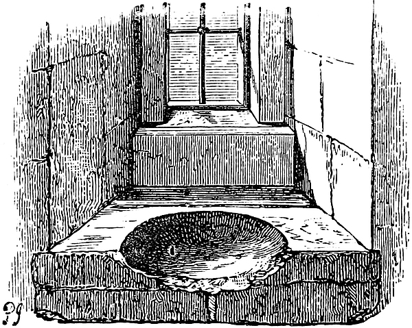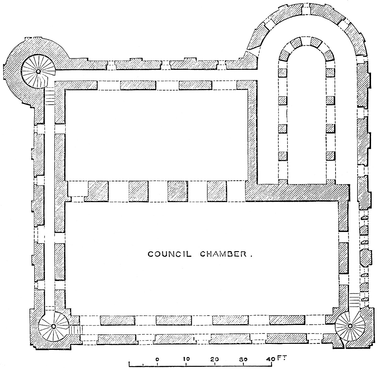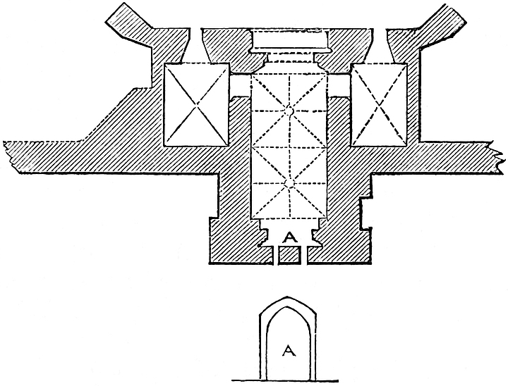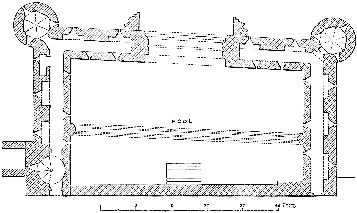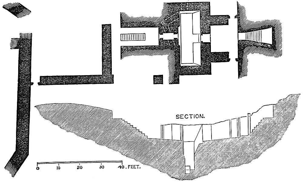 The east chamber, 55 feet by 24 feet, is entered on the east side, near the north end, by a large, full-centred doorway, flanked outside by nook shafts. From this a vaulted passage, 5 feet broad, traverses the wall, here 16 feet thick, and descends by eight steps into the main chamber. This inconvenient height was evidently given to secure headway for the vault below the vestibule. In the entrance passage, on the left or south side, a door opens into the well chamber, a vault, 16 feet by 8 feet, with a loop to the east upon the great staircase. At the south end of the vault, upon a step, is the well, 4 feet diameter and 289 feet deep, lined, as far as can be seen, with ashlar. In the east wall is a recess for a spare bucket. Near the entrance, at the north end of the east wall of the great chamber, a door leads into a curved passage which descends eleven steps into the north-east staircase. At the south end of the same wall a large arch, 5 feet above the floor, opens into a mural chamber 8 feet by 7 feet. This arch has been reduced by modern brickwork, to support the great vault. In the same chamber a loop opens upon the grand staircase, and in the south wall is a door and a descent by eight steps towards the chapel. It is possible that the loop was originally a small door leading into the upper floor of the middle tower of the forebuilding, and that thence, in Tudor days, a small wooden gallery led to the north door of the ante-chapel. In the south end of the great chamber is a window recess of 7 feet, opening with nearly flat sides. In its west jamb is a fireplace, in the east a door leading into a mural vault 18 feet by 12 feet, over that by which the first floor is entered. This vault has a loop to the east upon the great staircase, on the north the eight steps, already mentioned, and in the south wall a narrow door and mural passage leading to the robing-room and ante-chapel. In the north end of the great chamber, near the north-east corner, a door opens into a chamber 7 feet by 5 feet, which lies in the north wall below the window recess, here of 8 feet opening.
