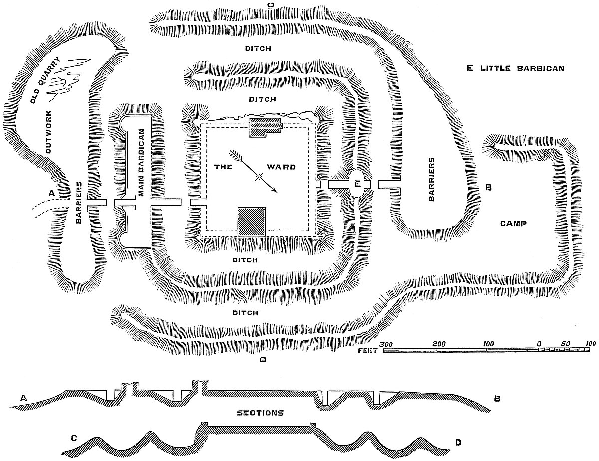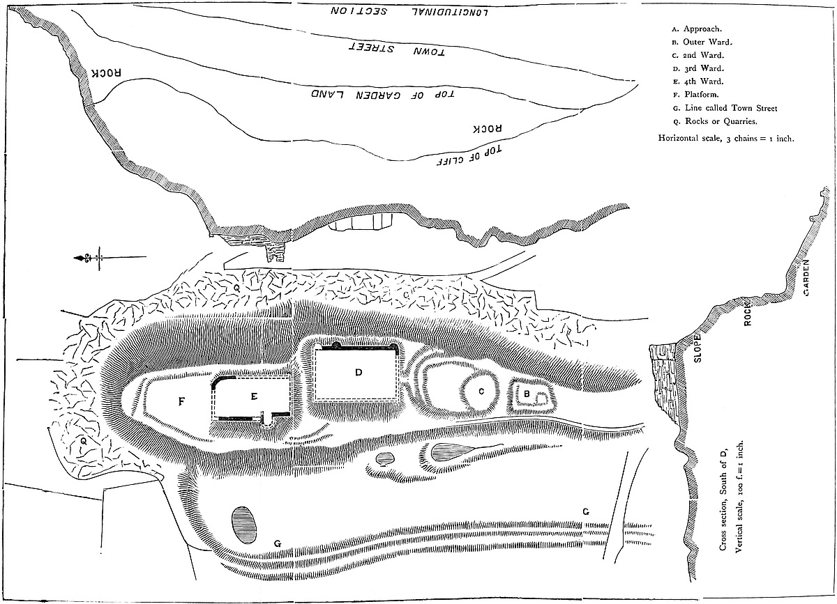 The artificial scarping of the hill sides is confined to the upper 80 or 100 feet. At this level are two platforms or shelves, one, a small one, towards the south, the other much larger, also chiefly natural, towards the north, and which forms the lower ward. The lower ward is of a semilunar or semioval figure, the hollow side being formed and occupied by a portion of the skirts of the tor. It measures about 33 yards north and south by 126 yards east and west, and covers about half an acre of ground. The outer or convex edge, steep by nature, has been cut into a low cliff, supported by a retaining wall, which, with its flanking towers and superstructure of parapet, protected this ward. At the foot of this wall, part of which supports the present house, the slope recommences, and, though now terraced by roads and paths, formerly descended unbroken to the base of the hill.