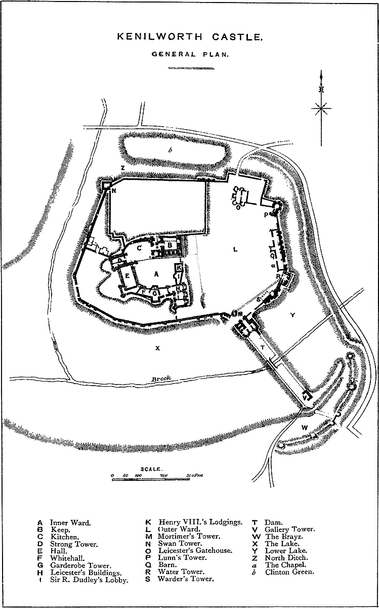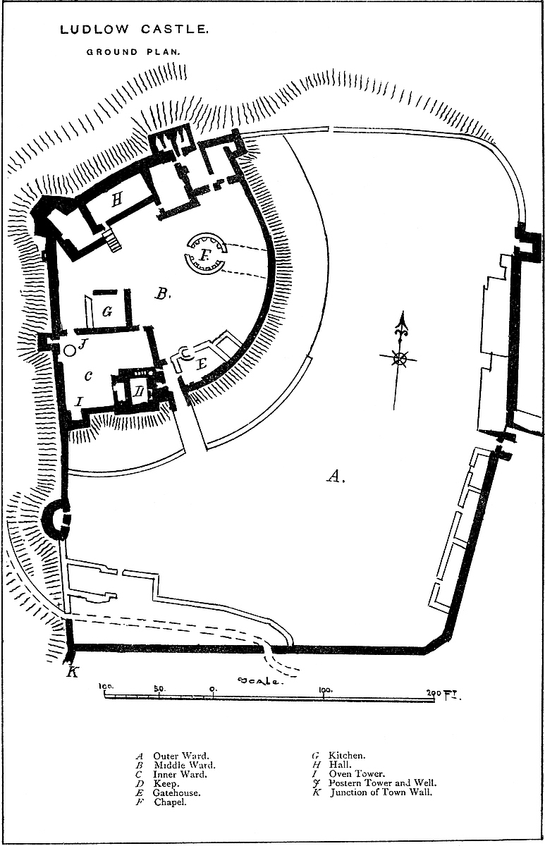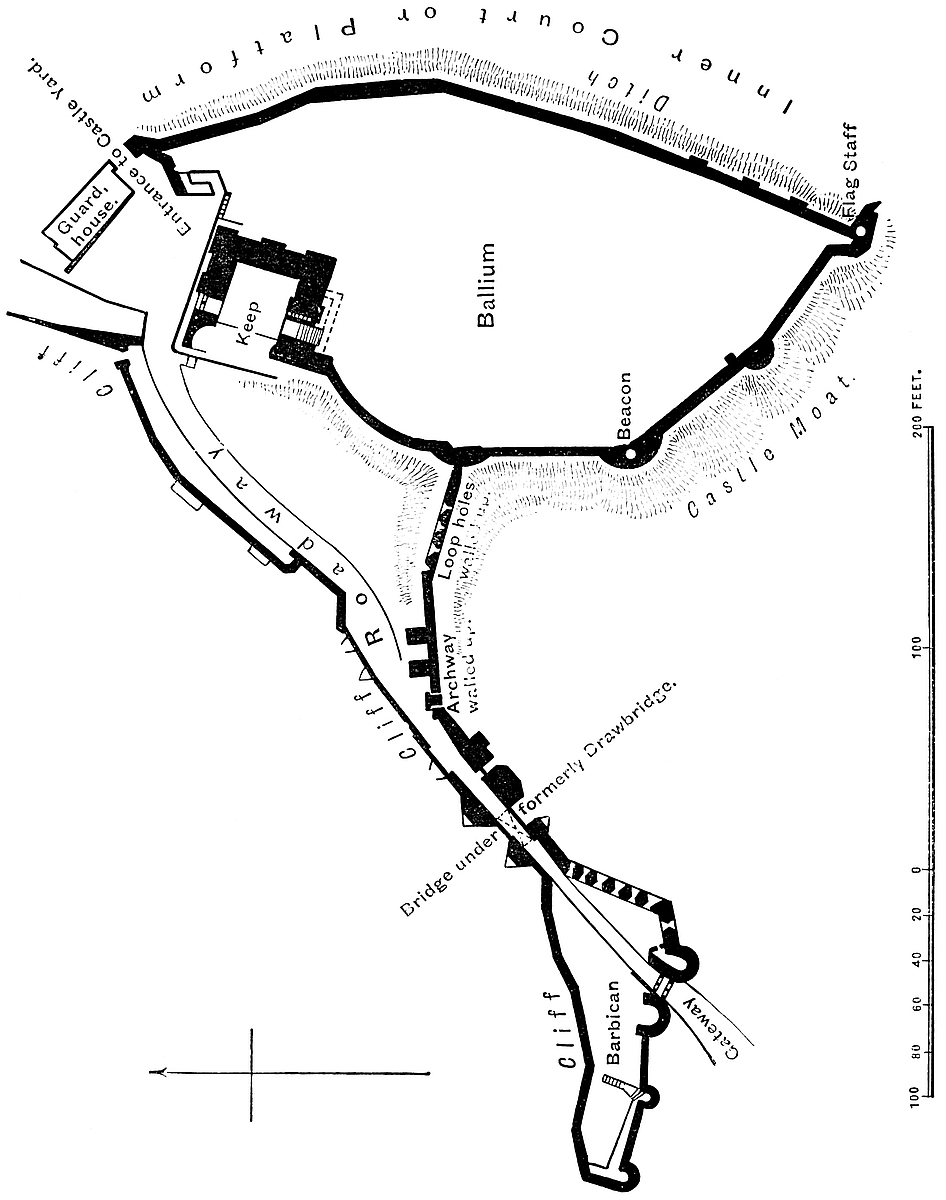 The Middle Ward includes the southern half of what was probably the English earthwork. Its southern two-thirds is rounded, but at its base are, or were, walls and towers connecting it right and left with the curtain of the outer ward, which it thus divided into two parts. In advance of this work were three towers: two, to the east and west, Clinton and Mortimer, were square. Both seem to have been of Norman date. The central tower to the south was circular, and was called Valence. It was, no doubt, later, probably of the reign of Henry III. The foundations of Clinton Tower were laid open and removed in 1794. A fragment of Mortimer’s Tower remains. Valence Tower was destroyed in the last century. The gatehouse of the ward is called Colton Gate. It is Norman, but an octagonal story has been added to the square base. The curtain connecting these towers is gone, and the lofty south bank has been scarped, and its outline changed. In this ward is a well 380 feet deep, once covered by a tower.