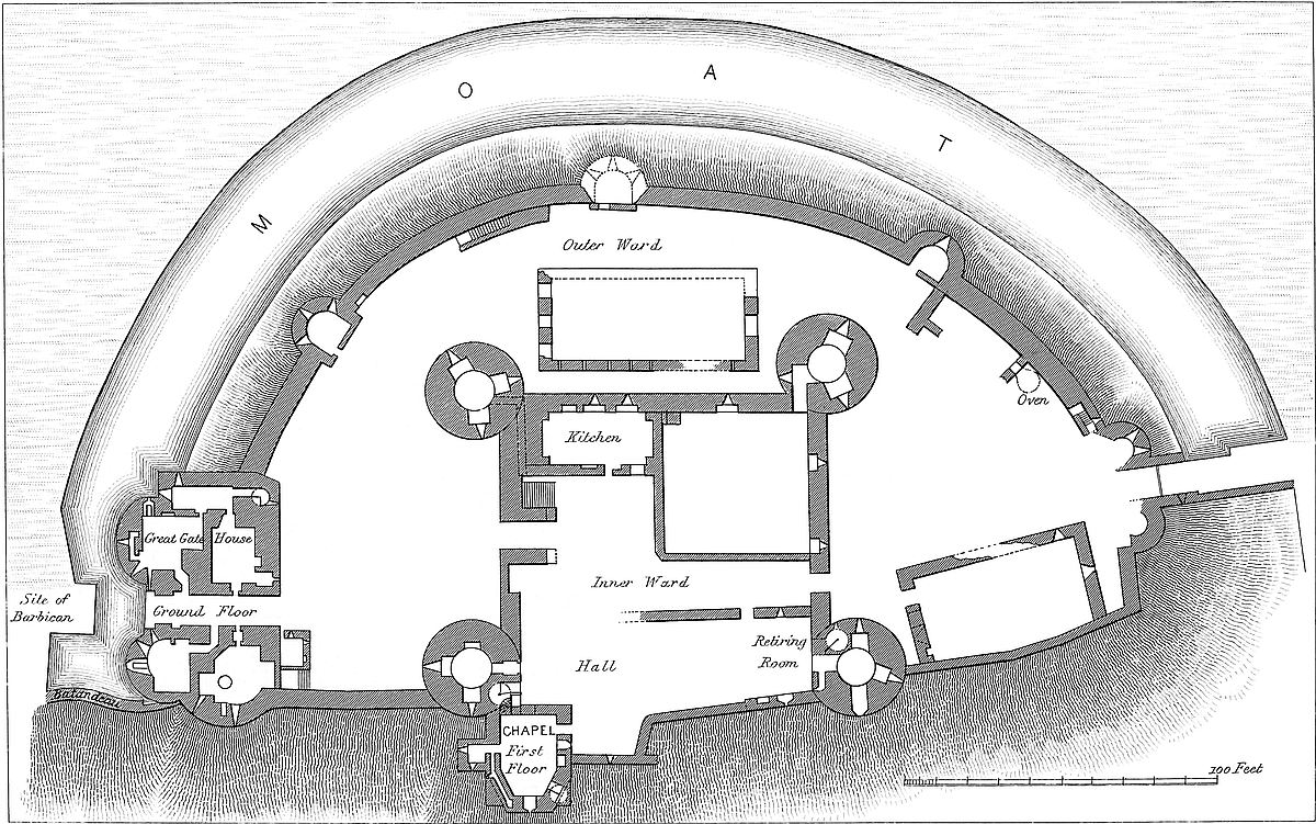 The Keep and Inner Ward are Norman, of the reign of Henry II., but the curtain and most of its towers have been refaced or rebuilt, a great part recently, but more or less on the old lines. The plan is an irregular polygon, about 120 yards each way, with fourteen rectangular mural towers of no internal projection, and not rising above the curtain, which, however, is lofty. Two of those to the south-west take their name from Magminot and one from Gore. The walls were of flint rubble, quoined with ashlar, and battering outside at the base, the top of which is marked by a bold cordon of stone. Upon the sides of some of the towers are bold machicolated openings from garderobes. The keep stands detached in the centre of the ward, and within the area, built against the walls, are several buildings, as Arthur’s Hall, the guard chamber, and the officers’ quarters, some of early English character, others modern.
