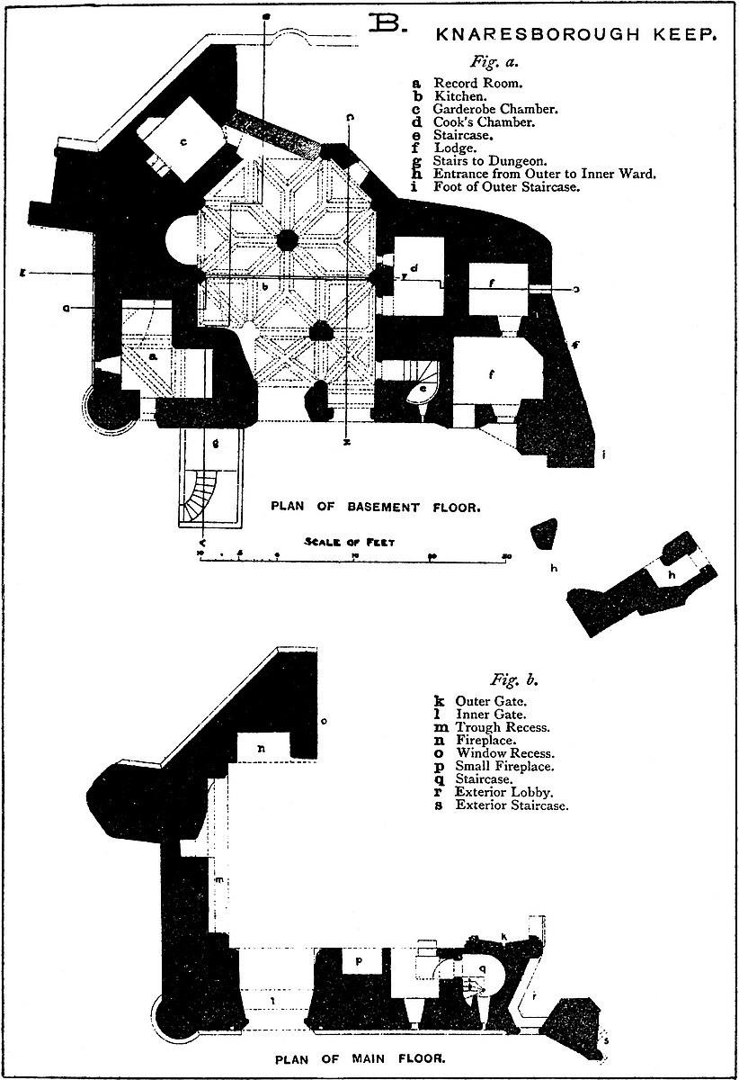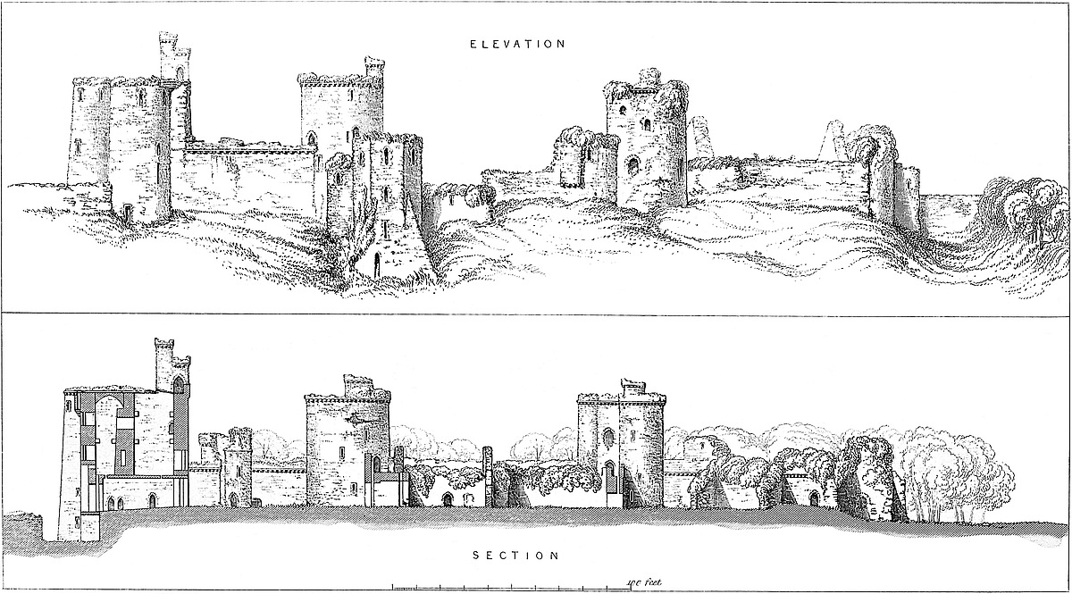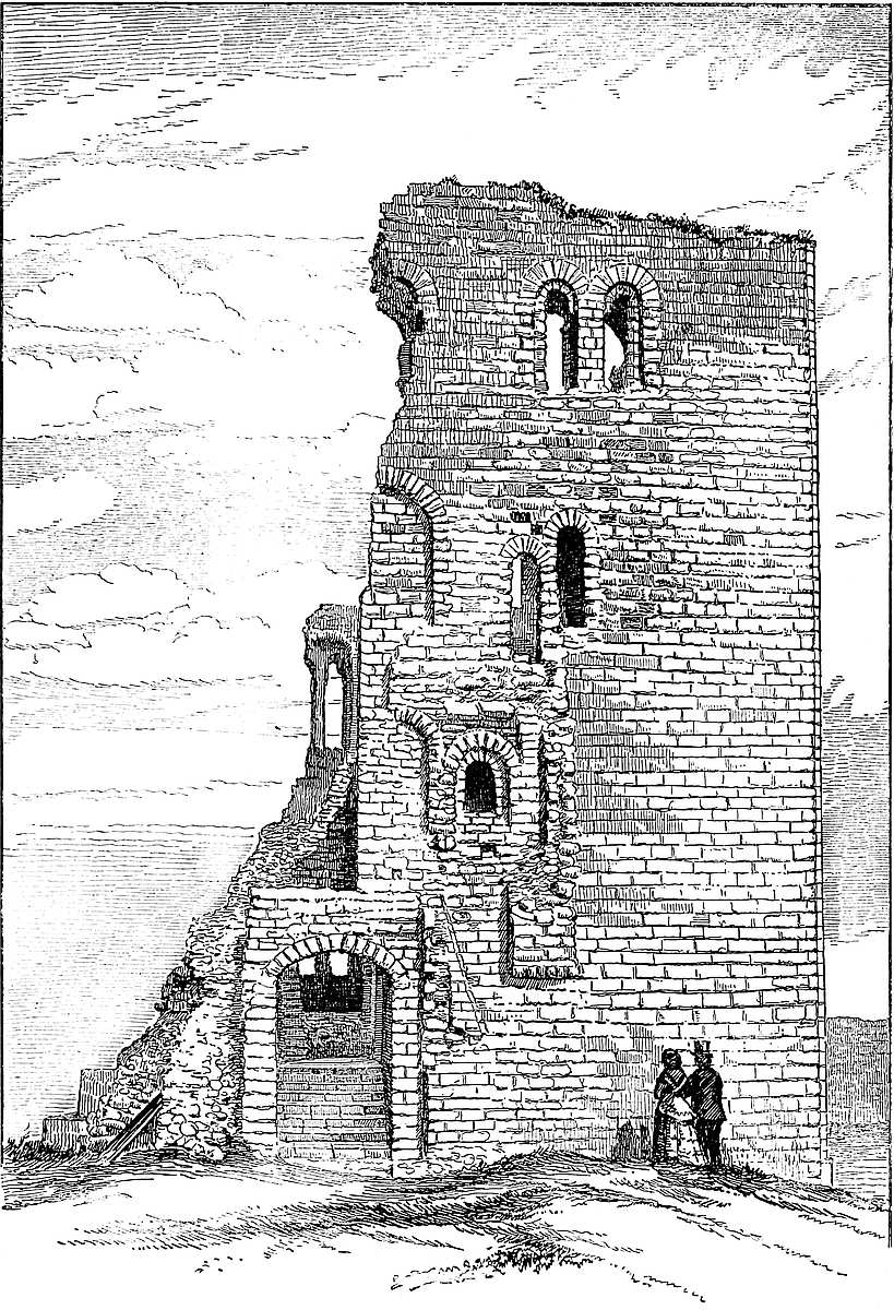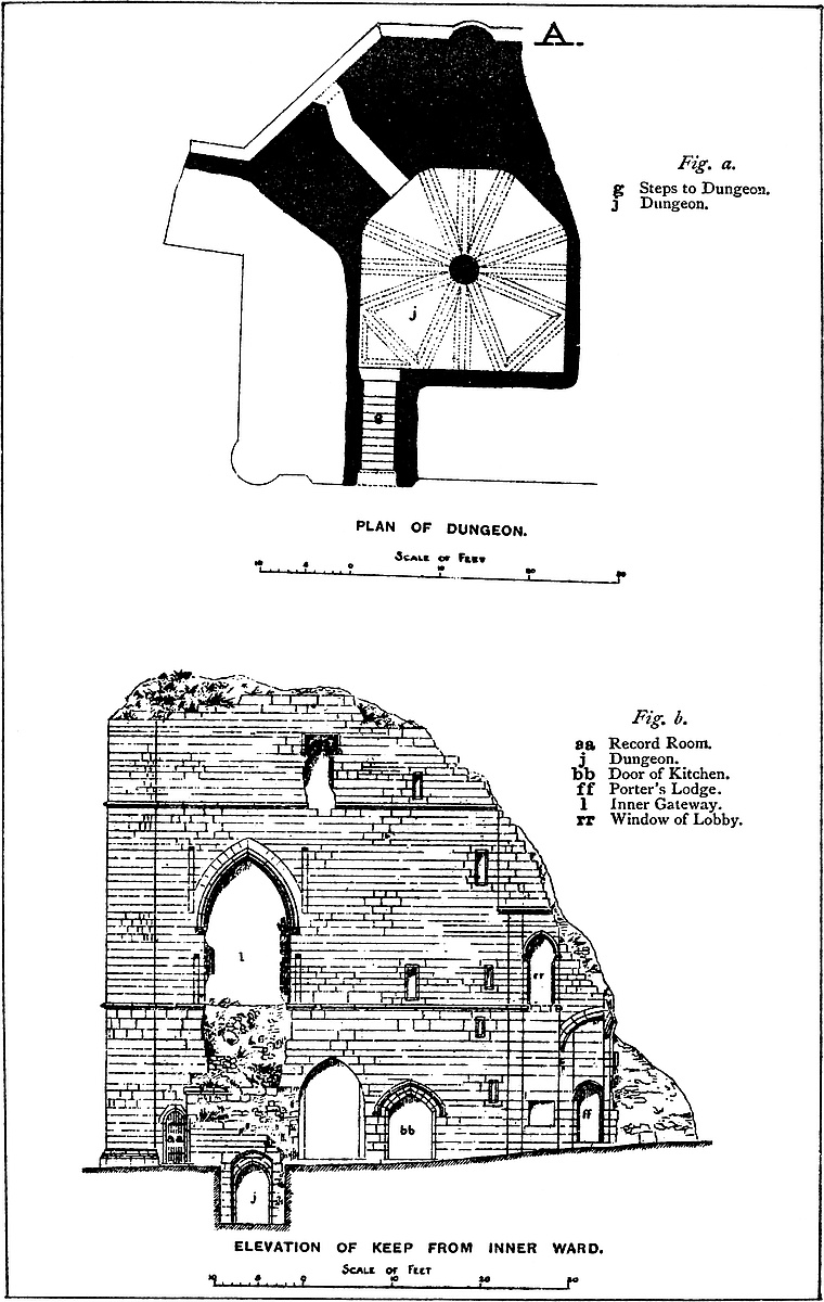 The general view here added is taken from the north, and shows the constable’s gate and bridge, and in the foreground the towers and curtains of the outer ward on this side. Immediately behind them are seen the square towers and the curtain of the inner, or Norman ward, and within all rises the keep, applied to the east side of which are seen the three towers of the forebuilding.