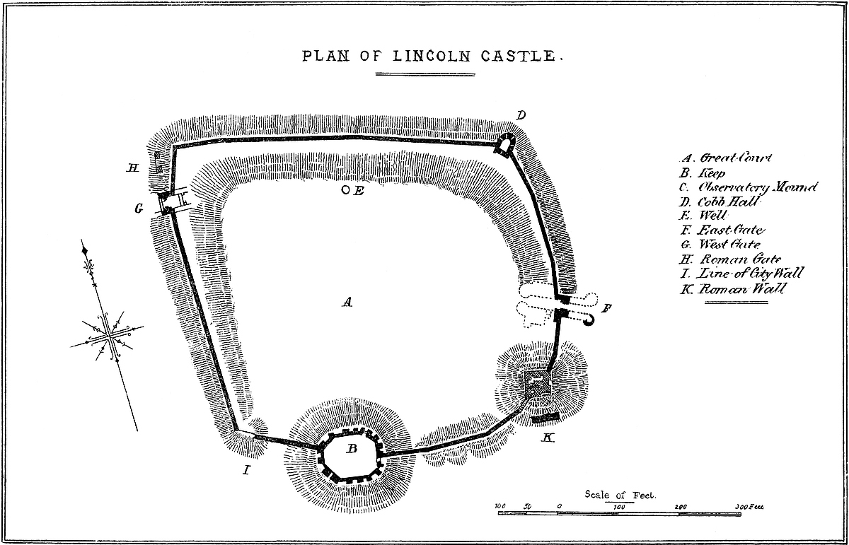 The castle is composed of two parts, due to the natural disposition of the ground; these are the tor or keep, and the lower ward. The tor is in form oval, and its summit, naturally flat, has been further levelled by art, as the slopes also have been trimmed, and rendered almost impracticable for direct ascent. The summit measures about 35 yards east and west, by 70 yards north and south. The keep, which stood here, has disappeared, and its existence, long a matter of tradition, may now be deduced from a sewer and some foundations in the south-west corner laid open a few years ago. The present surface was laid down as a bowling-green in the last century, and a summer-house constructed at the north-east corner, in which is a window in the Perpendicular style taken from some earlier structure.