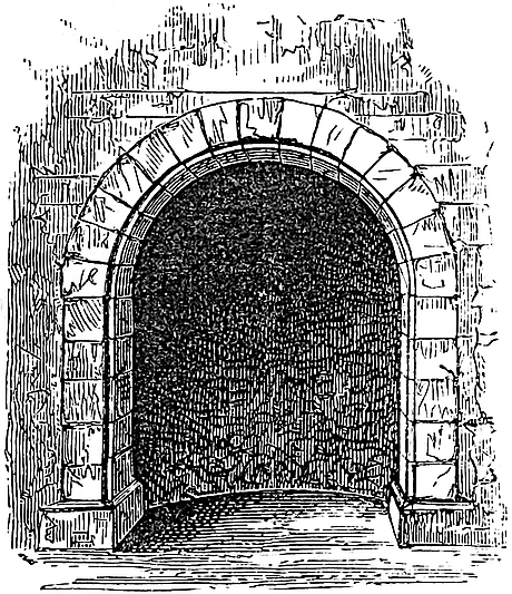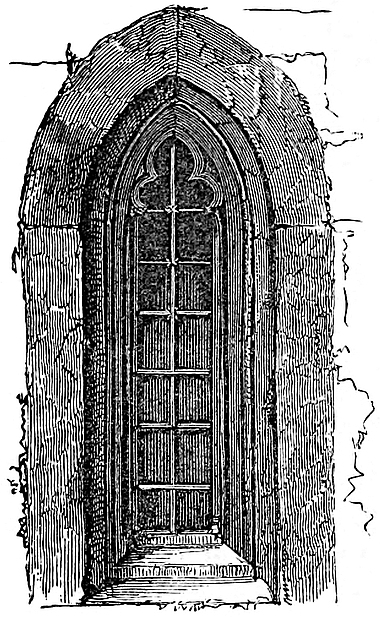 The keep was probably either circular or polygonal, approached as at Lincoln by a direct flight of steps from the lower ward. Its gateway seems to have been defended by a portcullis, as one is mentioned in the records, which could not have been in the earlier26 gateway or the later gatehouse. The buildings and inhabited part of the old castle were in the lower ward or its north-eastern quarter, upon the enceinte or curtain wall, and on the site, generally, of the present house. The wall was strengthened and flanked by half-round towers, of which the lower part of several remain incorporated into the later building and connected with fragments of wall, now a part of the house, and betrayed by their excessive thickness. One of these walls has a core of the natural red sandstone rock, enclosed in masonry, but traceable by an occasional exudation of dampness. The gateway of this ward remains between two of these flanking towers. It is 9 feet broad, with plain chamfered jambs, and a low stiff drop arch. There was no portcullis, and probably no drawbridge, the only defence being a door composed of bars of oak, 4 inches square and 4 inches apart, forming a grating, planked vertically outside with inch-and-a-half oak plank. Upon each oak bar was laid a bar of iron, and the whole fabric was spiked together with iron fastenings, having diamond-shaped heads. The meeting line of the two valves was guarded by an iron bar. In the right valve, on entering, is a wicket-gate 3 feet 8 inches high by 2 feet 6 inches broad, fastened with a huge iron lock in a wooden shell. This very curious specimen of carpenter’s and smith’s work, though of later date than the gateway, is old, not unlike that of Chepstow Castle, and probably of the time of Henry VIII. or Elizabeth. The gateway itself belongs to those of Henry III. or his son. In the last century the gates were permanently closed, and behind them was built a wall backed with earth. The gateway has recently been restored as far as possible to its original condition, and now gives access by steps to the lower ward.