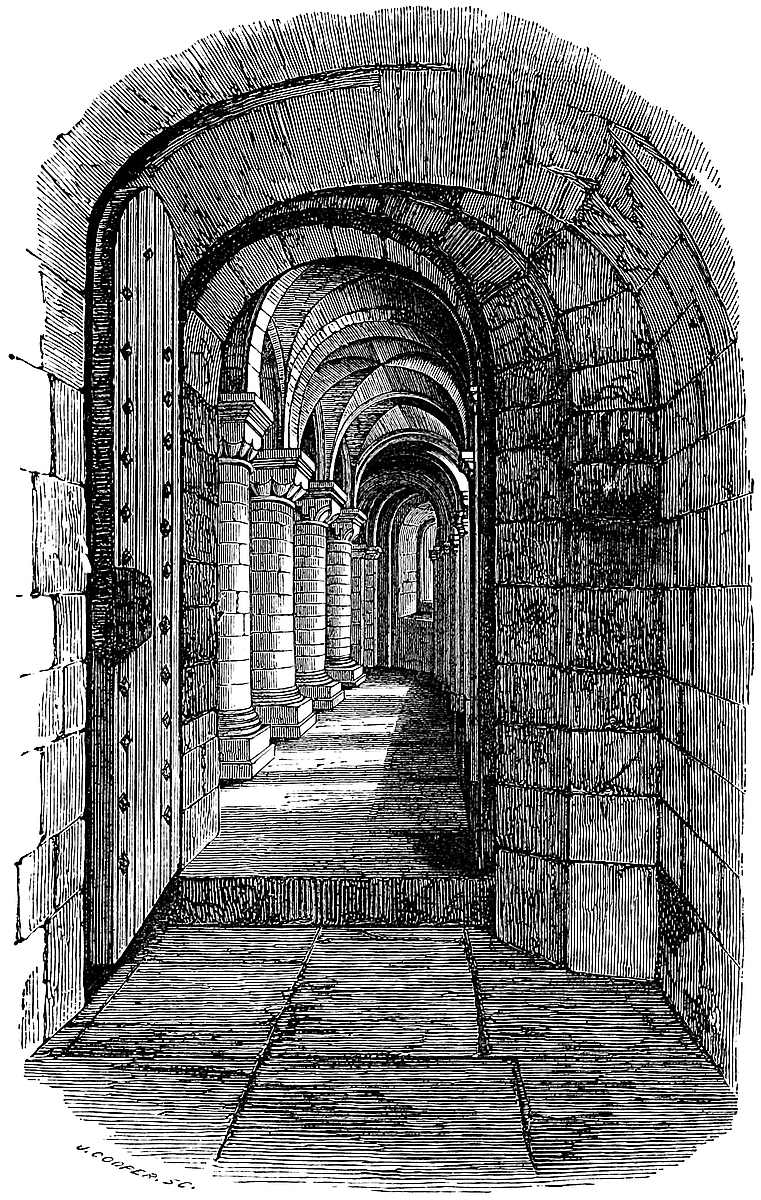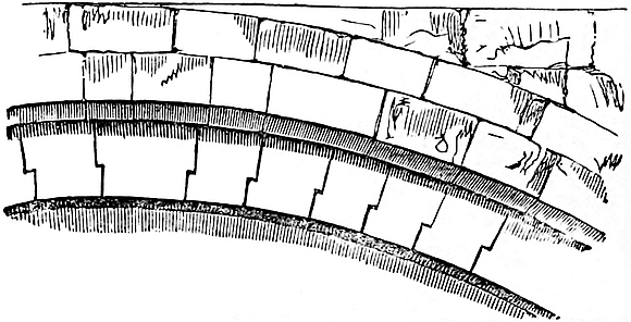 The material of this keep is chiefly the rag stone of the country worked as rubble, not very regularly coursed. Ashlar, mostly of Caen stone, is used freely for the door and window dressings and the quoins. The joints are close. The pilasters are of unusual breadth and projection. The chapels and the lower vestibule are highly ornate, with much of the chevron and roll mouldings, and occasionally of the dog-tooth. The arches are sometimes segmental, but more commonly full centred. There is no portcullis in the building; the entrances were closed with doors only, secured with wooden bars. None of the loops that open on the staircase could be used in its defence. Excepting about the main door there is no ornamentation in the keep itself. Doors, windows, and fireplaces seem to have been quite plain. This is the only known keep in which there is a second well, and it is difficult to understand why there should be two so near together, the expense of making which must have been so great. The upper gallery is of very rude masonry indeed; the lines of the passages do not coincide with the general direction of the walls, and the execution is very inferior. It is unfortunate, with ample buildings all round, that the authorities should pervert this very curious keep to vulgar and dangerous uses. The stores should be kept elsewhere, and the brick vaulting and additions be removed. The external breaches and doors in the walls should be closed, the second well cleared out, and the whole building as far as possible restored to its original condition. It might then be fitted up as a museum of arms, and every part, including the ward,24 made accessible. The reputed date of this keep is 1153, when the foundations are said to have been laid by Henry, grandson of Henry I., shortly before he succeeded to the throne. This coincides sufficiently well with the evidence of the building itself, which is late in the Norman style.