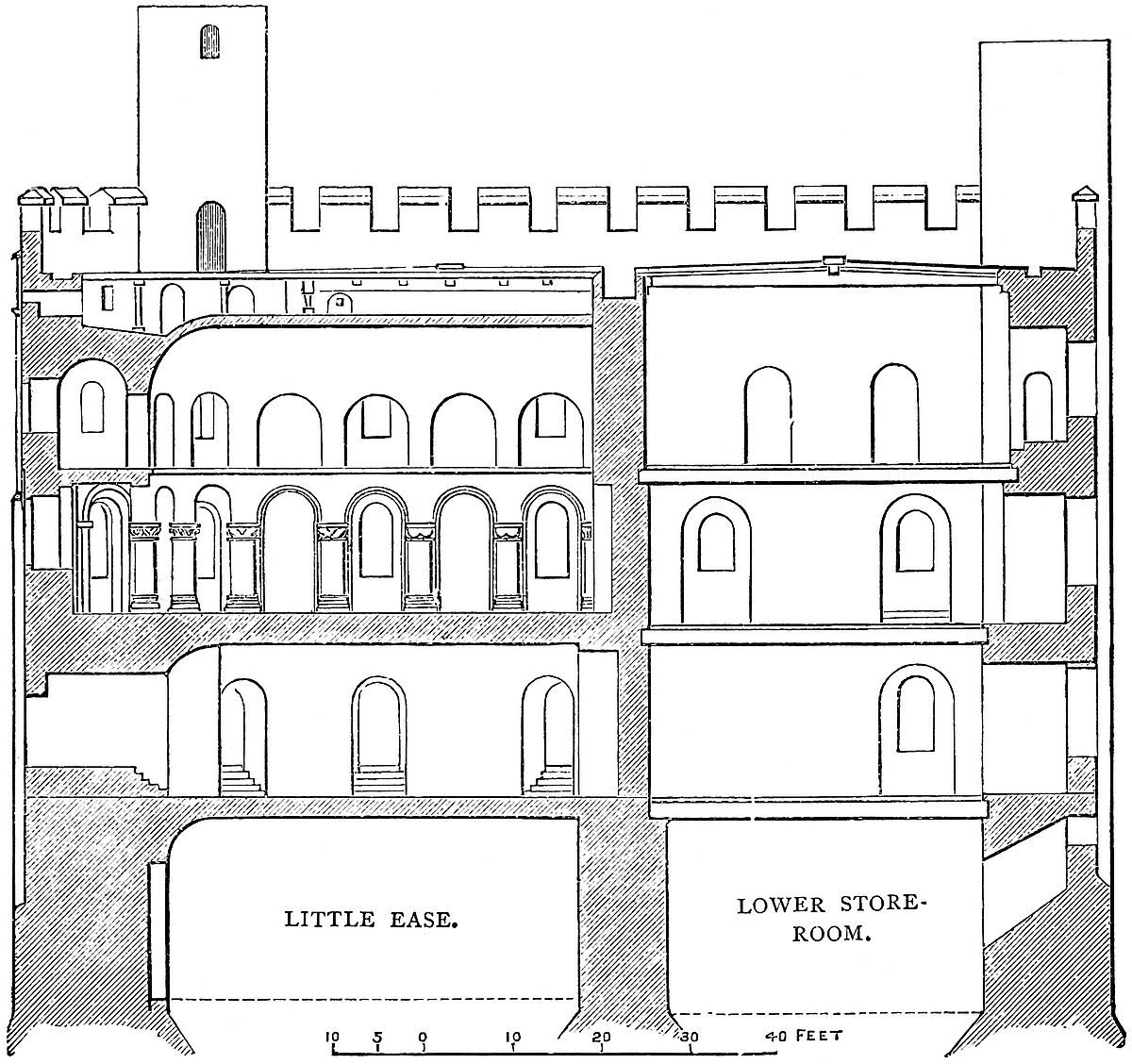 The second floor is the main or state floor of the building, and that into which opens the great entrance. As in the keeps of London, Rochester, and Hedingham, it had two tiers of windows, the upper passing through a mural gallery. Early in the present century this floor was covered in by two large brick vaults, slightly pointed. The object was to convert the ramparts into a platform for cannon. This clumsy addition completely conceals the upper half of the walls and destroys the effect of two very fine chambers.