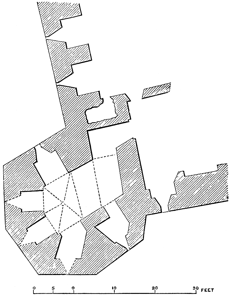 The appended sketch shows the general plan of the place. It is, roughly speaking, a triangle, the east side, of 160 yards, resting upon the river, and the north side, of 140 yards, projecting from it at a right angle. The third side, or hypothenuse, is convex and irregular; measured upon the curve, it is in length about 220 yards. The area, complete, is about 3½ acres.