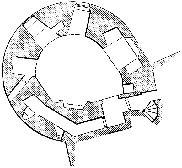 The Castle of York, to which the Conqueror directed his special548 attention, ought, one would suppose, to retain some memorials of that age. This, however, is not the case. The wall in the lower ward, upon the Foss, may, in parts, be early in the twelfth century, but the round mural towers cannot be earlier than the reign of Henry III. Clifford’s Tower, indeed, the keep of the fortress, is a very interesting structure. Circular or polygonal keeps, such as Cardiff, or Arundel, or Pickering, were often of the Norman period; but the regular round or quatrefoiled tower, introduced largely by Philip Augustus into France, found its way into England, and the two principal varieties of castle keep of the quatrefoil pattern were at Warwick, now removed, and this at York. It is in plan a quatrefoil of 60 feet and 80 feet diameter, with walls 9 feet thick and 40 feet high, three of the angles above the first floor being occupied by circular turrets corbelled out, and the fourth by a small square projection, which contains, below, the entrance, and above, a small chapel, handsomely arcaded and embellished with the dog-tooth moulding. This keep had a ground floor looped all round, and a first floor with corresponding loops. Probably the chambers were attached to the walls, and supported upon posts and beams, leaving a small open court next the entrance and containing the wall. Two circular staircases lead to the first floor, and from thence to the battlements. The tower has been much injured by attempts, first to destroy and then to repair it. The tower itself looks of the reign of Richard or John. The chapel has been regarded as an addition, if so, it is a very early one. York Castle was notorious in the reign of Richard I., for the dreadful tragedy perpetrated there upon and by the Jews in 1189. The castle was then burned, and we are told that Osbert de Longchamp, governor for the king, and who took up the cause of the Jews, rebuilt the work of Rufus in the castle. Probably this included the keep, very nearly as it is now seen. There was a second and very narrow ward outside the present castle wall, capped with low drum towers, apparently of the reign of Henry III. or Edward I.