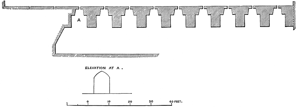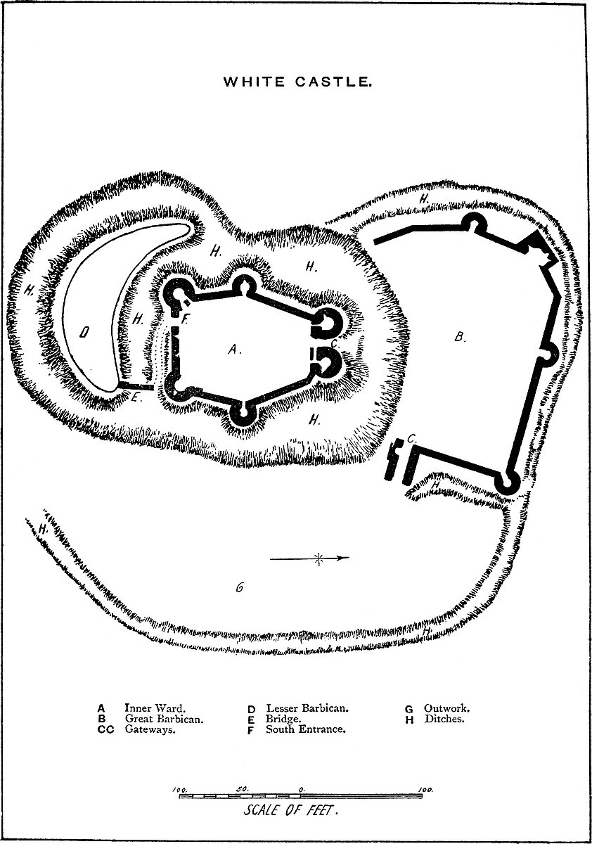 The Outer Ward is contained within a curtain, much of which is reduced by an internal ramp to a parapet wall. Upon the three landward sides it is narrow, and chiefly occupied by the ditch of the middle and inner wards. Upon the remaining or southern side it expands and includes a large space between the middle ward and the cliff. Its circuit is only not complete because its walls rest at either end upon the cliff. The plan of the wall is irregular, with an occasional angle or shoulder for raking the ditch. Exteriorly it rises from the outer dry ditch, and upon it are twenty-seven towers of various dates, figures, and dimensions, square, circular, and multiangular. Most of those on the western face are simply hollow bastions, and have no internal projection. Those on the eastern face are mostly mere sentry-boxes, or bartizan turrets of small dimensions. Upon the seaward front, where the cliff is perpendicular, there is no wall. The ingenuity of the engineer has been exercised on the landward and weaker sides. Five of the towers are connected with gates. These towers, commencing at the south-west angle of the ward, near the cliff, are: 1. Canon’s or Monk’s Gate, now destroyed; in it was a well. 2. Rokesley’s Tower, semicircular. 3. Fulbert de Dover’s Tower, square; near which was long the office of the “bodar,” or sergeant-at-arms, to whom all civil warrants of arrest for debt or breach of the revenue laws were addressed. Fulbert’s Tower was also his prison. 4. Hirst’s Tower, semicircular; it commands a shoulder or re-entering angle in the wall. 5. Arsick’s Tower, semicircular. 6. Gatton Tower. 7. Peverill’s, Beauchamp’s, or Marshall’s Tower. This is also the gatehouse between the two divisions of the outer ward, which was strong, with a ditch on the south front, and a drawbridge. It was also the marshal’s prison. 8. Port, Gosling, or Queen Mary’s Tower, having been repaired by that sovereign. 9. Fiennes’s Tower, or the Constable’s Gate. This is one of the grandest gateways in England. It is in plan a triangle with its obtuse angle presented to the field. The angles at the base fall within the line of the curtain, and are capped by two large drum towers. The salient angle in like manner is capped by an oblong tower, rounded at each end and flat in the centre, through which the entrance passes. These three towers are large and lofty, and are connected by an embattled curtain. Within the triangle a central tower rises to a still greater height, and commands the whole. The entrance passage is broad and vaulted, and provided with gates and a portcullis. Within, it opens upon the level of the outer ward; without, it terminates abruptly upon the scarp of the ditch, there about 50 feet deep. From this gateway a bridge communicates with the opposite bank. A single lofty pier rises from the centre of the ditch, and from it an arch springs to the outer abutment, carrying a regular roadway and parapets. In the opposite direction the parapets alone spring, as two arches, from the pier to the gateway, and serve to steady the pier, but the roadway is omitted, and its place supplied by a drawbridge. This arrangement is not uncommon, but is here specially necessary, owing to the height and consequent15 weakness of the pier. Upon the counterscarp of the ditch is a tête-de-pont, from which a steep road descends by a traverse towards the town. This gate, though open, is but little used. The ordinary gate is modern, and near the site of Canon’s Gate. The Constable’s Gate is of the Decorated period. Its interior is said to be very curious, but is not shown.