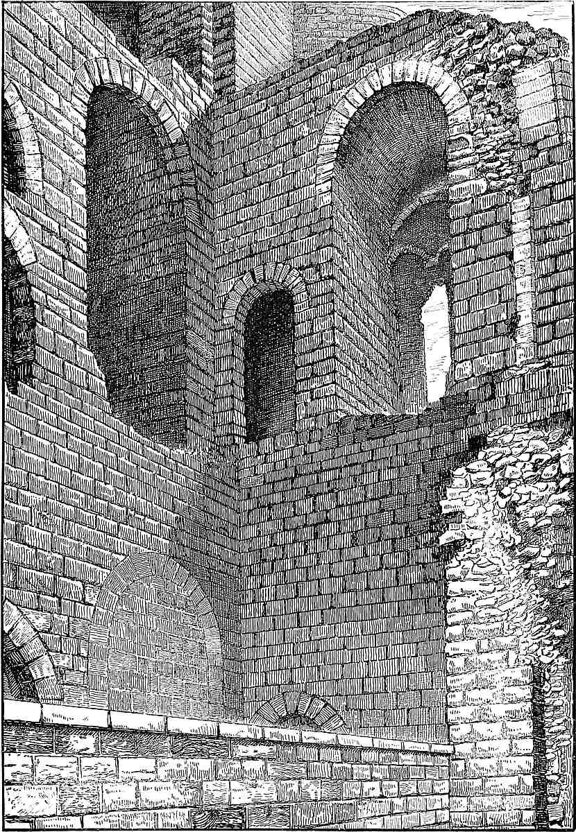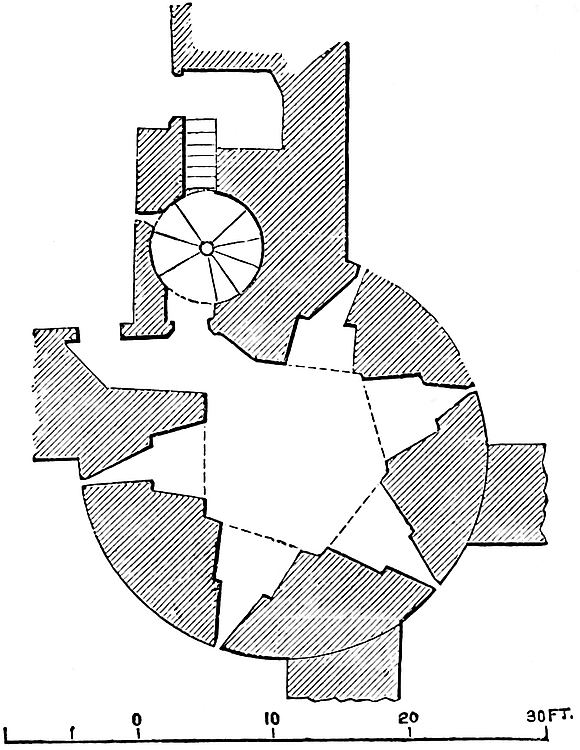 The Norman who first took possession of these formidable works evidently laid his additions upon the English lines, either he or his successor superseding the timber palisades by walls of masonry. Upon the summit of the mound he built, as the foundations still show, a circular or polygonal tower as a keep. From thence a curtain wall sprang from its opposite sides and encircled the small eastern area, forming the inner ward. The wall was so placed that532 it became a revetment to the old bank, which thus took a place as a sort of ramp within the area. The apex of the area, that is, the end opposite to the mound, was capped by what appears to have been a round tower, of which only a heap of ruin remains. North of this, the curtain, which was the outer wall, is still seen to be of considerable strength. What remains is about 6 feet thick and 30 feet high, and is strengthened outside by a square mural buttress, or bastion. To the south a large window-opening and some cross-walls indicate a domestic building. At the south-west angle, next to the mound, is a fragment of a lofty tower containing a well-stair. This marks the junction of one end of the outer curtain with the wall of the inner ward, as the ruined round tower does of its other end. Near this, in the south wall, much choked with rubbish, is an opening with a low, pointed arch, once the gateway between the inner and the outer ward, and which, combined with various indications to be observed in the remaining fragments of the curtain and its tower, shows that, whatever may have been the Norman defences of this ward, they were removed and replaced by what is now seen in the Decorated period.