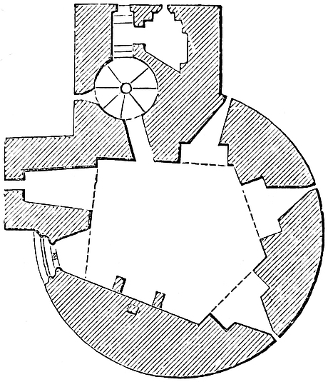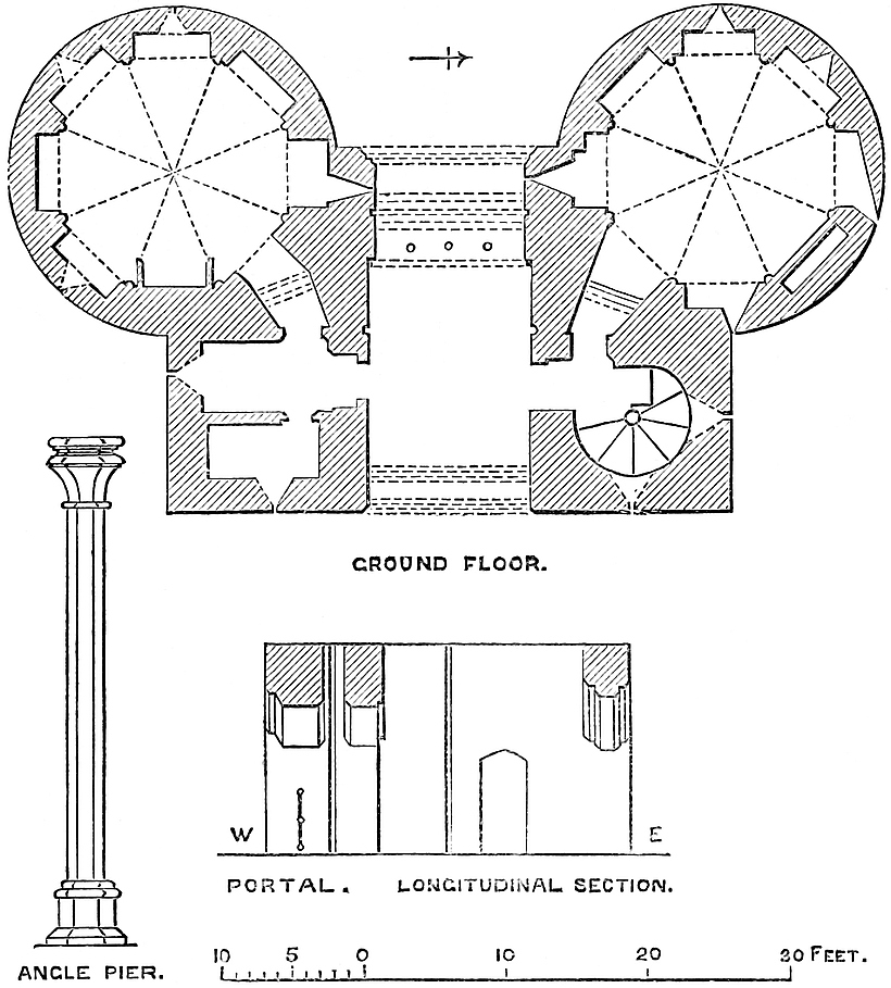 The roof of the keep is now an artillery platform, pierced on the south by six and on the west by five embrasures, the top of the pilasters forming a bay in the centre of each face. The two other faces are solid, and protected by guns “en barbette.” Of the four turrets, which are 21 feet square, with two entrances on each face, the two to the south have entrance stairs, and doors from the stair-head open in the side of those at the north-east and south-west angles. The north-west turret seems to be entered by an opening in21 its east face. Though these turrets have been much pulled about, their substance seems original.