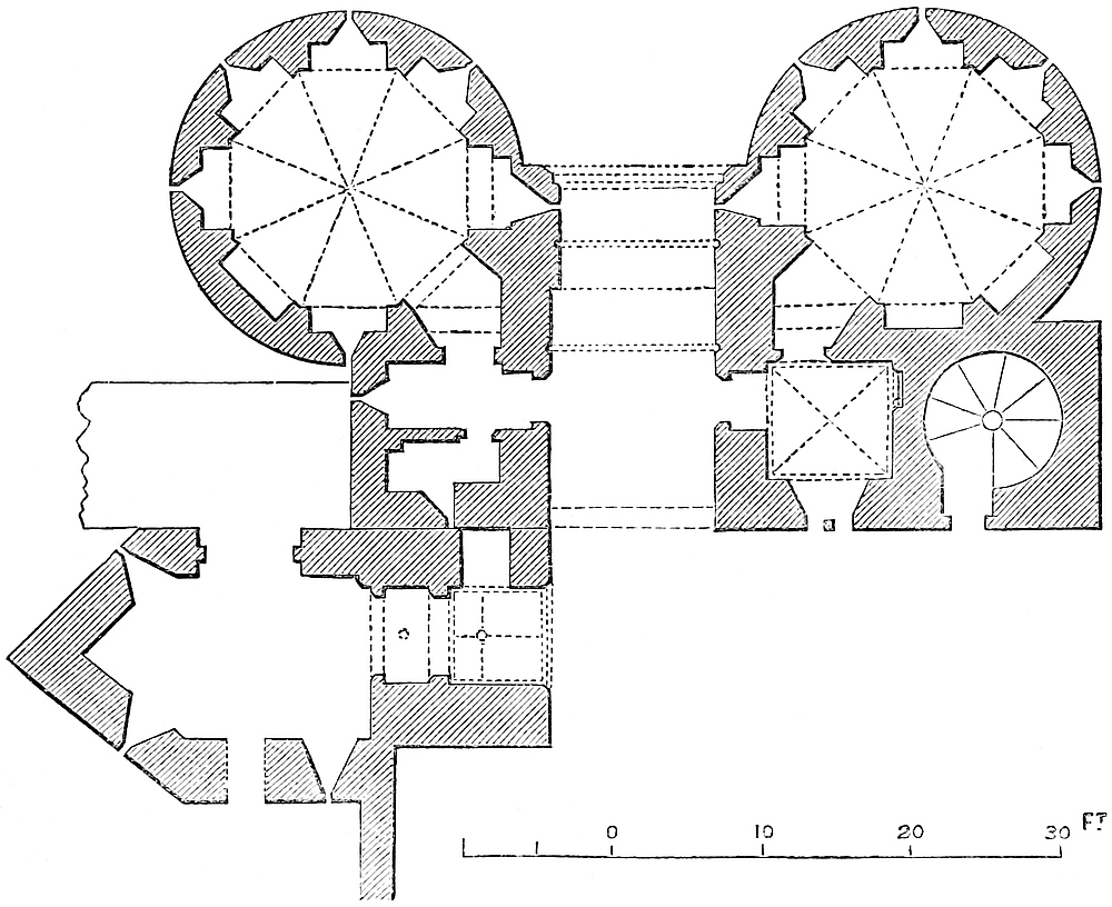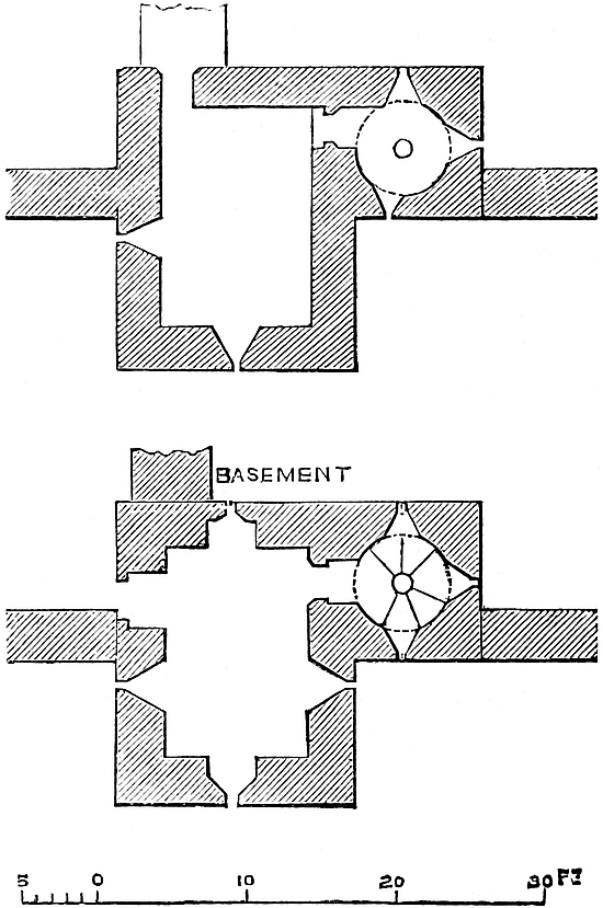 The forebuilding covers the whole of the east and about 45 feet of the adjacent south face of the keep. Its breadth ranges from 15 feet to 23 feet. It was strengthened by three towers, one over the north end or top of the staircase, one over the south-east angle or bottom, and one on the east front over the middle of the staircase. The middle tower, in which was the middle doorway, is unusual. These rose to about four-fifths of the height of the main building, and their battlements were reached, as has been shown, by doors from the upper gallery. The object of this forebuilding was to contain and protect the great staircase, and in it are three vestibules, a lower and upper chapel, and an ante-chapel, several mural chambers, and a well. The entrance at this time begins from the ground on the south front by an open staircase of ten steps, probably modern, as the original ascent seems to have been against and parallel to the keep wall. At the top of these steps is a landing, upon which opens the present entrance into the basement floor. The staircase then turns to the right and rises eleven steps, still open, having on the left the keep and on the right the flanking projection of the forebuilding, in which is the lodge, and above it the robing-room. In front is a lofty doorway, 7 feet wide, with a segmental arch, quite plain, and above it a loop which opens from the chapel passage. This was the lower entrance, and was closed by a barred door. Entering the doorway, eleven steps under cover lead to the lower vestibule, which is thirty-two steps, or 20 feet, above the ground. This vestibule is a handsome chamber, 15 feet by 12 feet, with an arcade of two arches in its south wall, each pierced for a loop. In the west wall, near the entrance, is the door of the lodge, a plain barrel-vaulted chamber, 13 feet by 6 feet, having a loop to the west. In the east wall of the vestibule is an arch of 7 feet opening, springing from coupled columns and flanked by two others. The head is moulded with the chevron pattern. This arch opens into the lower chapel, 14 feet by 13 feet, which occupies the south-eastern angle of the building, and is so placed that the altar could be seen if desired by each person who entered the keep. In its north and south walls are arcades of two arches, divided by a pier carrying two nook shafts and a third shaft in the centre. In the south-east arch is a loop, and opposite to it a cupboard. In the east end is also a loop, placed in a recess flanked by two shafts. The floor of this chapel is one step above the vestibule. The ceiling of both was flat, and of timber. Beneath chapel and vestibule is the vault already described. The walls of this part of the forebuilding are from 2 feet 6 inches to 5 feet thick.