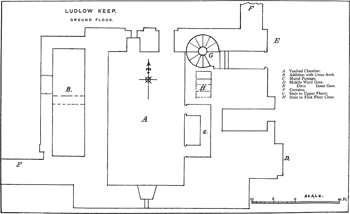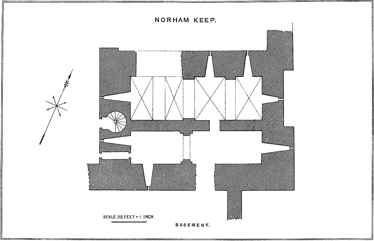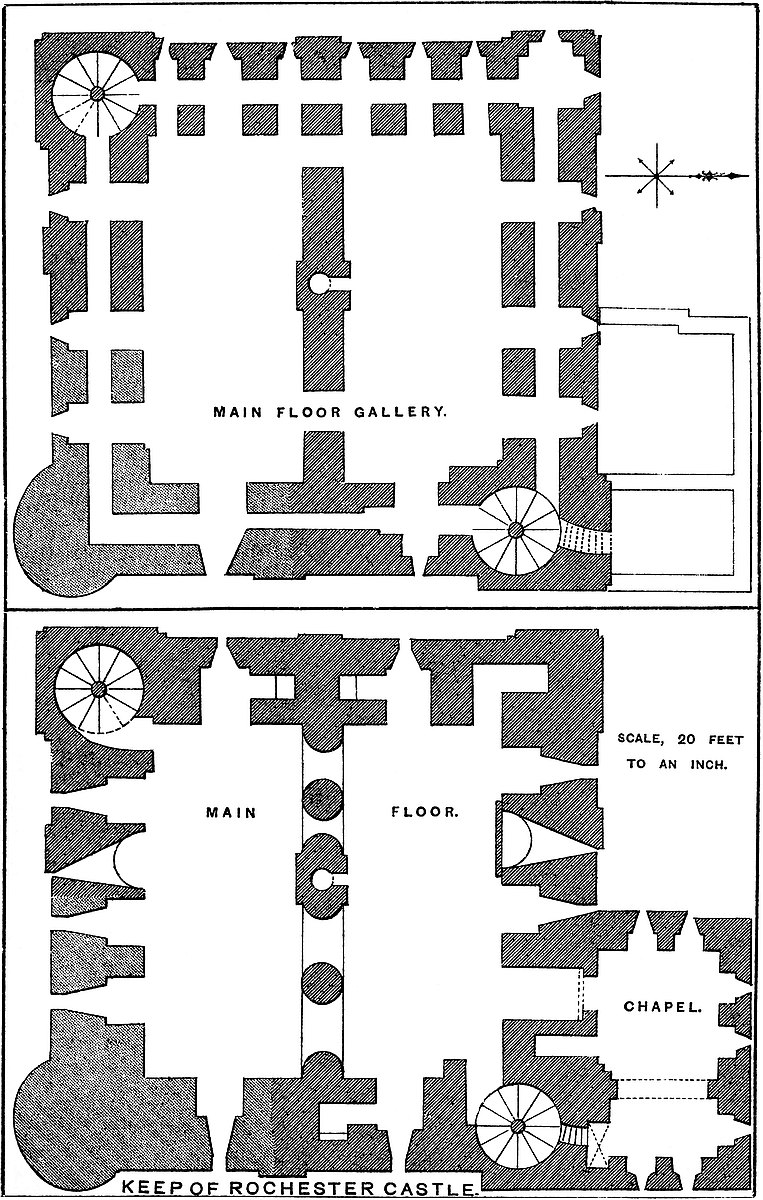 The Keep.—This is a very fine example of a late Norman keep. It is very nearly square, being, at the base above the plinth, 98 feet north and south by 96 feet east and west, with a forebuilding 15 feet broad by 115 feet long, which covers the east side and the south-east angle of the main structure. The angles are capped by pilasters 19 feet broad and of 5 feet projection, which meet to form a solid angle, and, rising to the summit, become the outer faces of four square turrets. On each of the three free faces is an intermediate pilaster, 15 feet broad by 5 feet projection, which rises to the same height with the parapet, and forms a bay in its line. There is a battering plinth, 6 feet high, from which the pilasters rise, and the total height of the wall is 83 feet, and of the turrets 12 feet more, or 95 feet. The base of the keep is 373 feet above high-water mark. The top of the plinth is marked, on the face of the pilasters, by a bold cordon or roll, and there are two sets-off of 6 inches common to both walls and pilasters, one at the first and the other at the second-floor level. The walls are of unusual thickness, even for a Norman keep. That to the west, between the pilasters, is 21 feet reduced to 19 feet at the first and to 18 feet at the second floor. The north wall is 17 feet, the south 19 feet, and the east 18 feet. The cross wall, which runs north and south, and divides the building nearly equally, is 11 feet at the base, and reduced to 7 feet and 6 feet at the top story.
