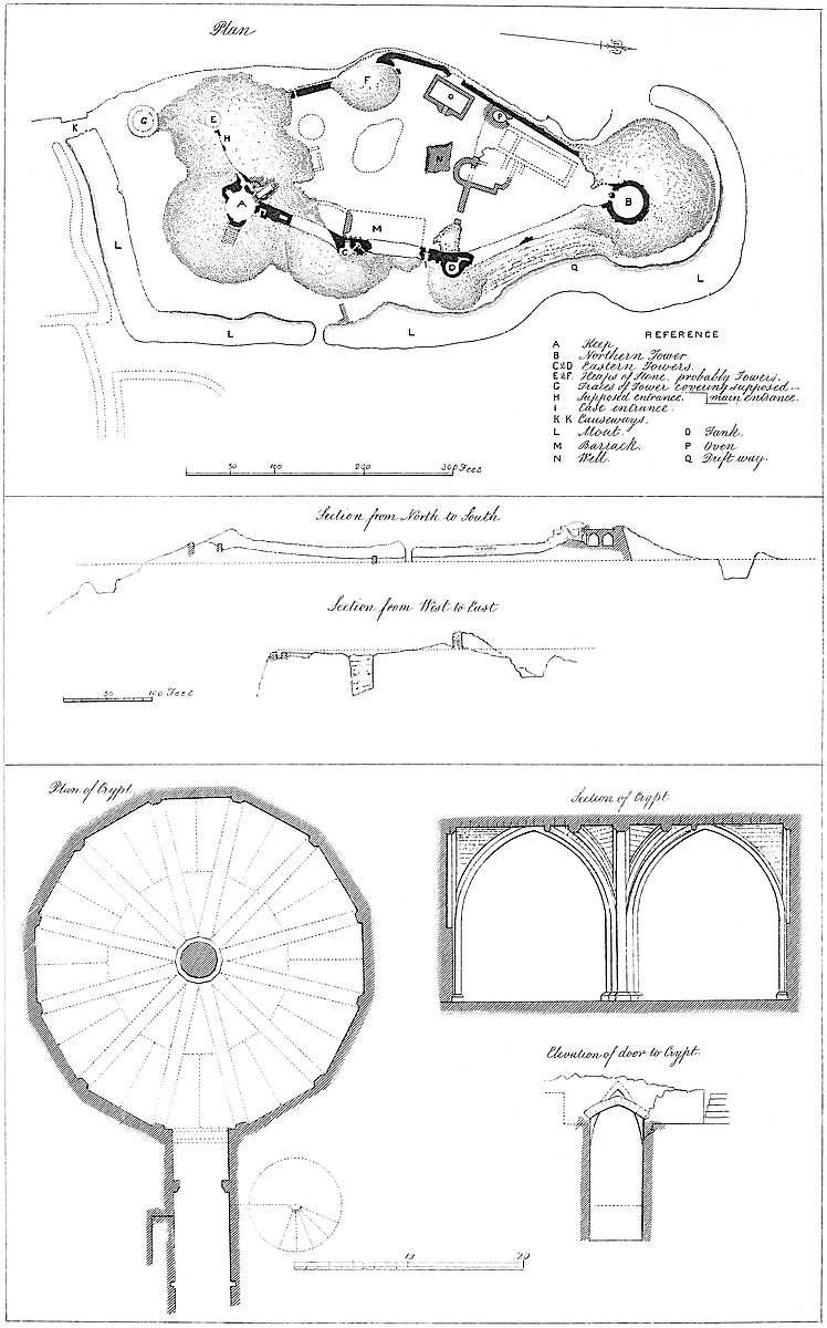 The tower, of which a tall fragment remains on the south-western side of the inner ward, marks the point of junction between the wall of that ward, the keep, and the wall of the outer ward. This latter wall, descending the steep natural slope, protects the inner ward gate from the west, and shows what appears to have been a postern, and beyond it a rectangular mural tower of bold projection, and marked outside by a bold cordon above its base. This is evidently an original Norman tower. Beyond it, being the southern wall of the ward, the Norman work is distinctly seen. The wall was in process of being rebuilt, and its imperfect junction with the new work is apparent. Of this later date is a curious large rectangular building, on the wall, of bold projection, and divided by a cross-wall into an eastern and a western chamber. It was of two floors, and below them a basement which has been vaulted over and fitted with exterior steps and doorways in the Perpendicular period. The building itself is early and excellent Decorated, as shown especially by the form and detail of a pair of two-light windows. From this tower the curtain, of the same date, extends to the great gatehouse which is to the south-east. This is much broken. It is rectangular, with a portal-vault below and two chambers above; one for the working of the outer, and one for that of the inner portcullis. The rib of the central portal remains, with a drop-arch and a square portcullis groove. In the inner chamber is seen part of a large fireplace with a good Decorated hood. Only one portal-arch remains, but from its position it is pretty clear that there were three. The archway is much choked with rubbish. From the great gatehouse the curtain curves sharply towards the north, enclosing the east face of the ward. Upon it is a bold half-round tower, of which the lower part, well seen from the ditch, and probably solid, is very perfect. It rises only to the533 level of the ward. Thence the curtain turns the north-east corner of the ward to the remains of a polygonal tower, or more probably a square tower with the angles boldly chamfered; and from this it ascended the slope so as to join the inner ward at its north-east angle, where the traces have been mentioned of a large and probably round tower; and thus is completed the circuit of the outer ward.