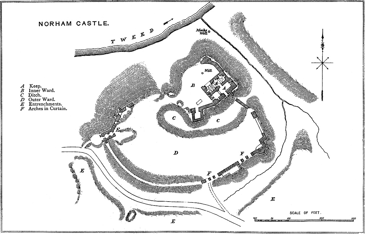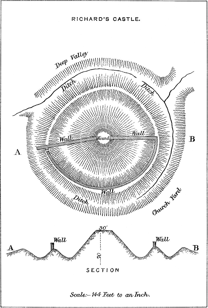 Wigmore, an English creation, bears an English name. It is first mentioned in A.D. 921, when the Saxon Chronicle relates that King Eadweard, in the Rogation days, that is about the 7th of May, “commanded the burh at Wisingamere to be built.” That this command was very rapidly as well as very completely obeyed, is clear from the fact, stated by the same authority, that, in the same year, probably at the commencement of autumn, the Danes with a great army laid siege to the new burh, “beset it round about, and fought against it far in the day, and took the cattle about it; and, nevertheless, the men defended the burh who were therein, and then they (the Danes) abandoned the burh and went away.” A527 strong place which was constructed in five months could not have been a work in masonry, and scarcely in dry walling; but with a proper force of men the earthworks of the mound and inner area might have been executed in that time. But earthworks alone would not have held an army of active Danes at bay. The slopes must have been strengthened with palisades, so as to protect the garrison and enable them to keep the enemy at a moderate distance. Fire was scarcely practicable, as the wood employed must have been green. Moreover, however hard Edward’s soldiers may have worked, it is scarcely probable that they could have done more than throw up the burh proper, or mound, and the banks containing the smaller area attached to it, or have prepared palisades for a larger front, even if formed. We are told that when Queen Æthelflæd’s warriors, in A.D. 916, took Brecenanmere, or Brecknock, by storm, they captured there the king’s wife, with thirty-four persons. The Burh of Brecknock, therefore, held probably but a small garrison: and its mound and inner circle, the parts, no doubt, then defended, are not, in point of size, greater than those of Wigmore, for which certainly one hundred and fifty to two hundred men would form, for a short time, a sufficient garrison. It was, then, to the passive strength of this position, and to its narrow front, that they owed their safety. The cattle taken probably pastured at the foot of the mound and upper area, within what is now the lower ward of the Castle, then, no doubt, but slightly protected.