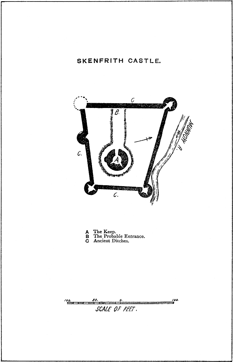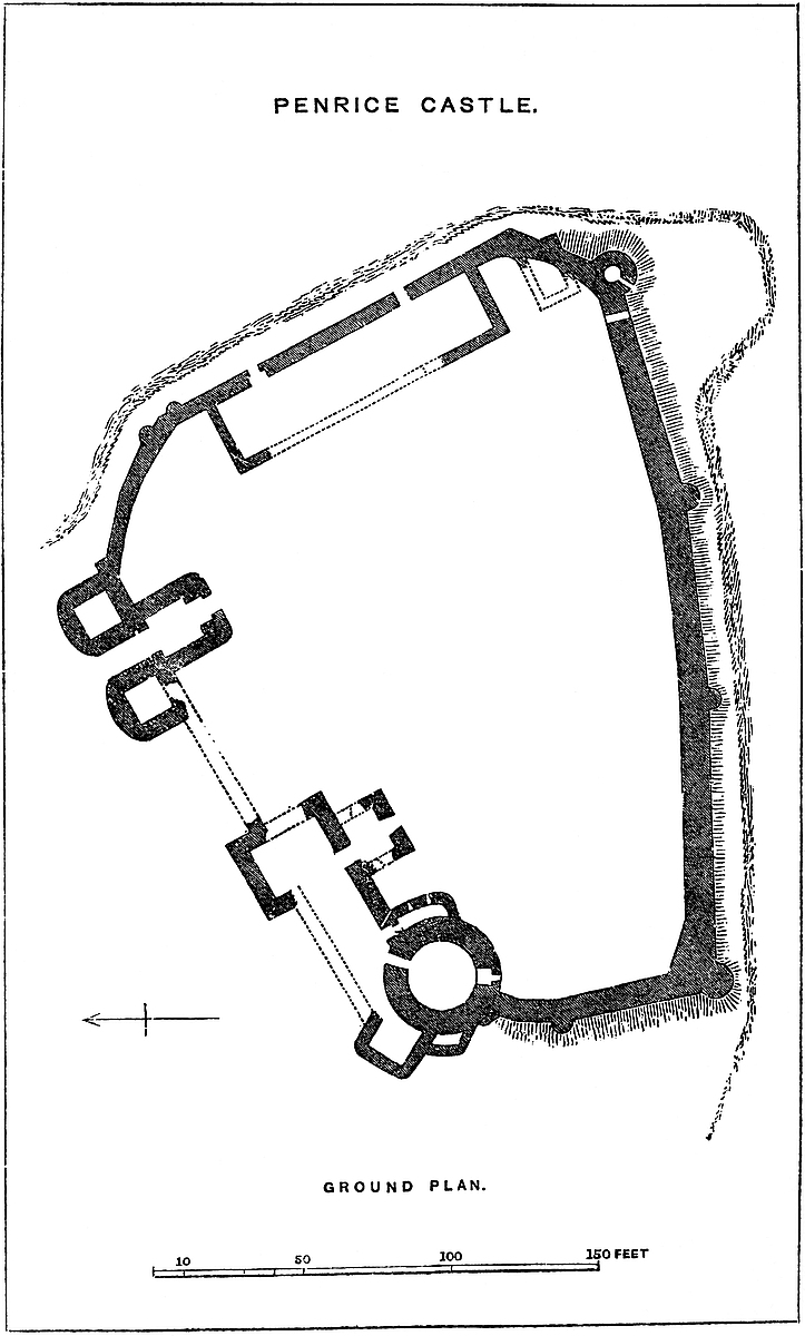 These works are very simple in plan, and of rude construction. A platform about 200 yards long by 100 yards broad occupies the centre of the ridge. Its rocky sides are scarped and revetted all round to a height of about 10 feet, and upon this wall was built a curtain of from 20 to 30 feet more, and about 5 feet thick. At each end a cross ditch was quarried in the rock, so as to isolate the castle from the equally high ground beyond. Probably there were no bridges across these ditches, and the entrance seems to have been by a plain doorway in the curtain upon the northern face of the works. The curtain appears to have been quite plain, without either buttress or pilaster or flanking tower, save at the eastern end of the area, near the centre, where are the remains of a circular tower about 30 feet in diameter with walls 5 feet thick. The curtain to the south, or most exposed, side is broken away; on the opposite side it is more perfect, and contains a doorway, broken, and now a mere hole in the wall. Within is a fragment of a building into which probably the gateway opened. The platform is very irregular, partly natural, chiefly from the heap of rubbish covering up the foundations of the domestic buildings. The building is not unlike Dinas Brân and Dinas Powis, and is probably of the age of Henry III. or Edward I., early in the reign. The material is the tile-stone of the country laid in courses. There is no sign of ashlar.