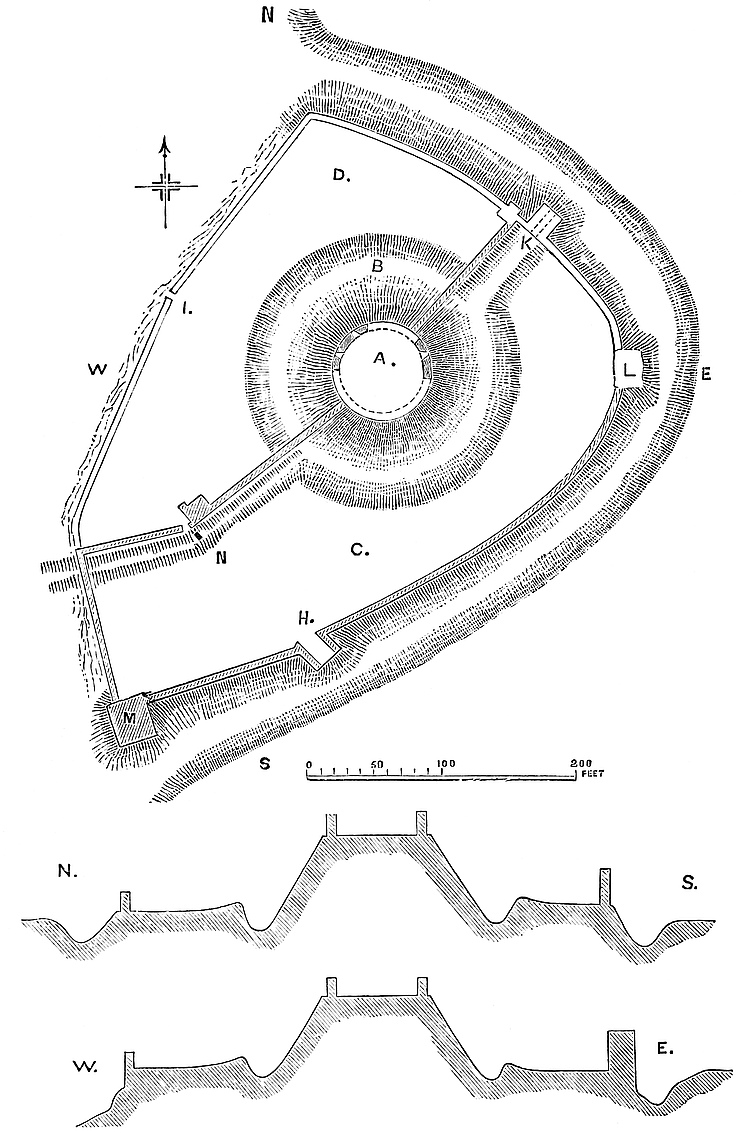It is evident that the earliest fortress was confined to the mound and the small area immediately attached to it, but that the defences of the outer area were speedily added to provide space for flocks, herds, and herdsmen, and a sufficient garrison. The defences, in so thickly wooded a country, would probably be of timber.