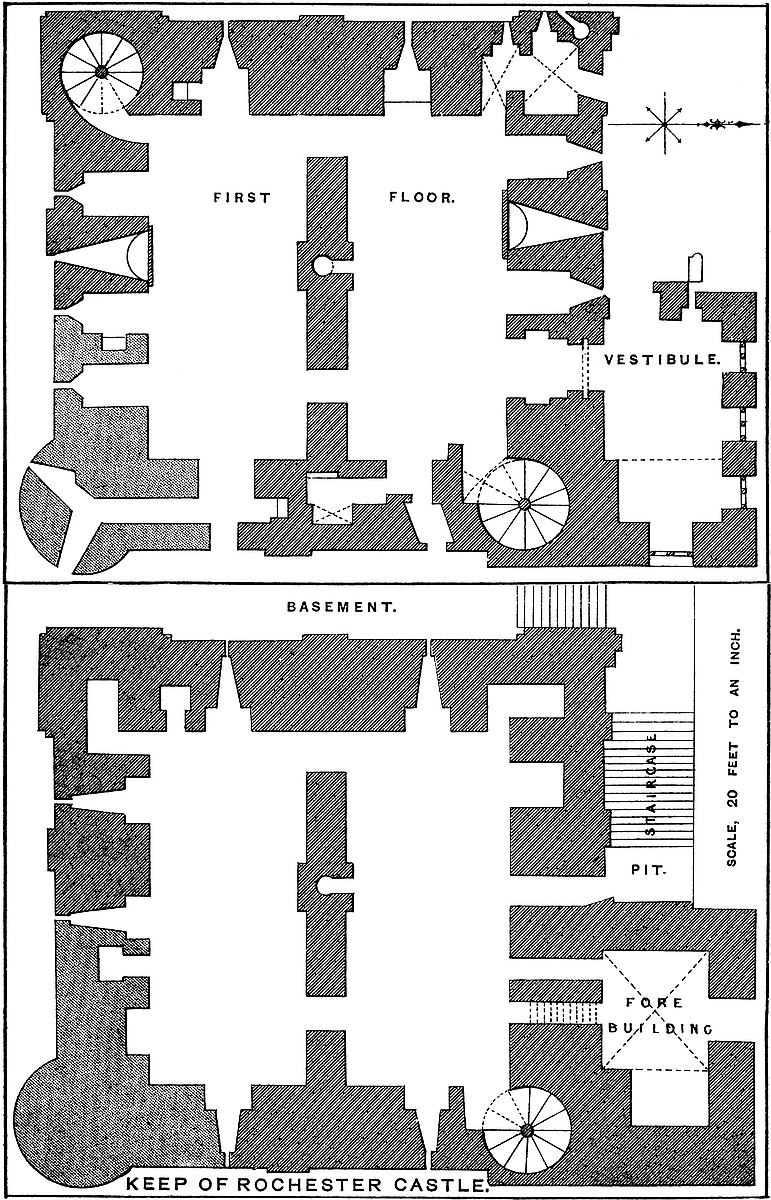 The main entrance is in the east face, near its north end, at the second-floor level. The forebuilding which covers it is the finest in England. It is in fair preservation, all but its roofs and part of its east wall, which are modern. As at Rochester, it is of masonry inferior to the keep, at least outside, and there is no cordon at the base of its pilasters, but it contains within more ornamental work than the keep, with which it is so intimately connected that it cannot be an addition. In the north-east and south-west angles of the keep are well-staircases remarkably commodious and well lighted. They are 14 feet 6 inches in diameter, the stairs being 6 feet 6 inches and the newel 1 foot 6 inches. They rise from the basement to the roof by 114 steps, and communicate with each floor, the two lower by lobbies, the upper and upper gallery by branching passages. From the north-east lobbies doors open into 17the two tiers of vaults below the upper part of the forebuilding. The extraordinary thickness of the walls is intended to allow of the construction of a very unusual number of mural chambers, of which there are altogether twenty-seven. Besides the main entrance there seems to have been one at the first-floor level, also from the forebuilding. Others have since been made, one probably in the fourteenth century, direct into the basement, and another very recently into the base of the south-western staircase. Besides these, divers loopholes have been converted into doors, to give external entrance to the basement mural chambers which are used as water-tanks and powder-magazines.