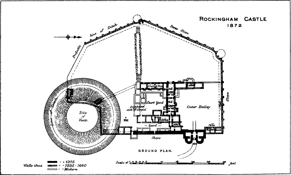 Close east of the mound, and above 40 feet below its top, is a roughly oval area, about 100 feet east and west by 50 feet north and south, encircled by a bank of earth, outside of which was a ditch, which included also the mound, and was probably the work thrown up by King Edward, and so gallantly held against the Danes. It is very strong, the ground falling away steeply on every side, and especially to the north and west. Upon the mound stood the Norman shell keep; the oval contained within a wall, most of which remains, was the inner ward. The mound and its appended oval stood within, and partly on the edge of a far larger area, which included the slopes, and extended nearly to the base of the hill towards the south and south-east, and on those sides protected the citadel. Towards the north and the west the steepness of the ground rendered a second line of defence unnecessary, and the mound and its oval formed there a part of the outer enceinte. This second area was also covered by a ditch which descended from the south side of the mound, and from the north-east part of the oval, and thus formed the outer ward of the castle, in which probably were pastured the cattle driven off by the Danes. The Normans enclosed this also within a wall. This ward was covered by a deep and wide ditch, wholly artificial; and this, again, at one point, by a second ditch across the ridge, towards the south. Within the outer ward, attached to the southern and south-eastern slope of the inner ward, was an enclosure of moderate area, taken, of course, out of the outer ward. The earthworks of this are slight, and it seems to be wholly of Norman origin, and intended as a middle ward.