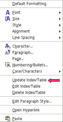 - Right-click anywhere within the Table Of Contents. Click Update index/table. (The entry in the "Table of Contents" changes.)